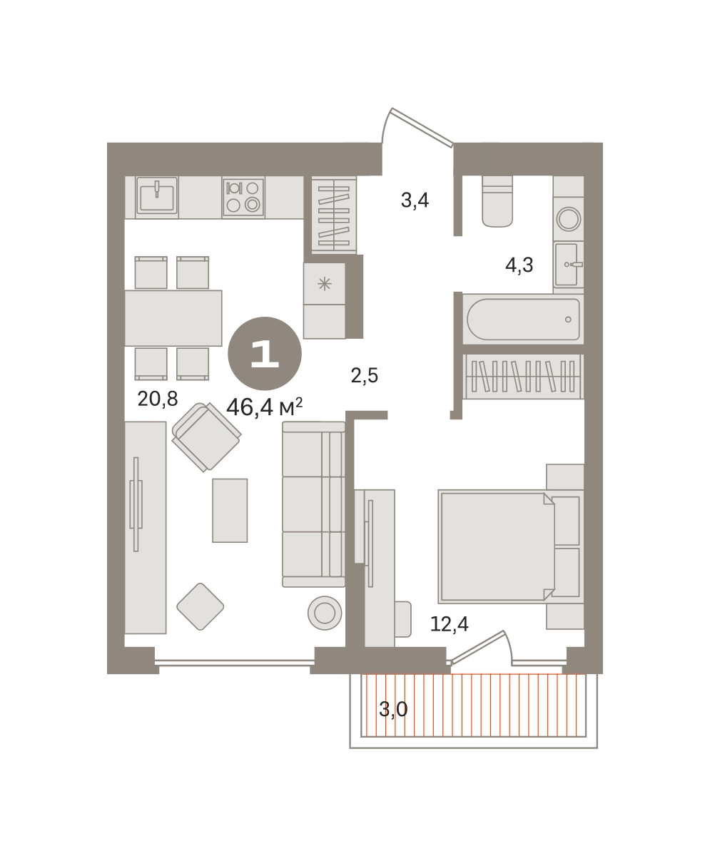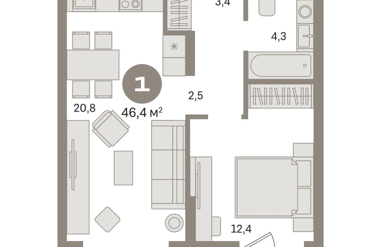 Квартира с кухней-гостиной и одной спальней в «Первом квартале». Особенности планировки: предчистовая отделка, балкон. № квартиры в нашей базе: МТК04-Ж4.3.4.О застройщике