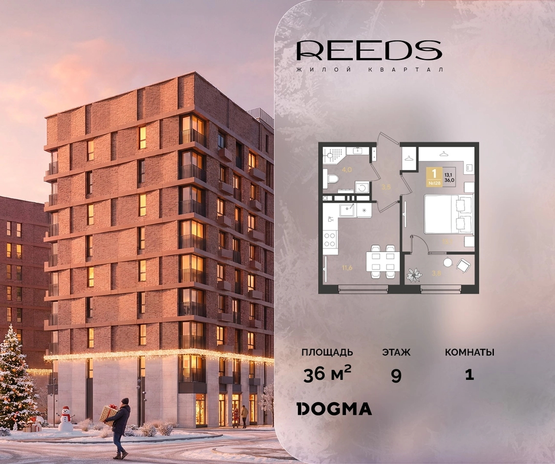Срок сдачи: (4 кв. 2028, общей площадью 36 кв.м., на 9 этаже.)