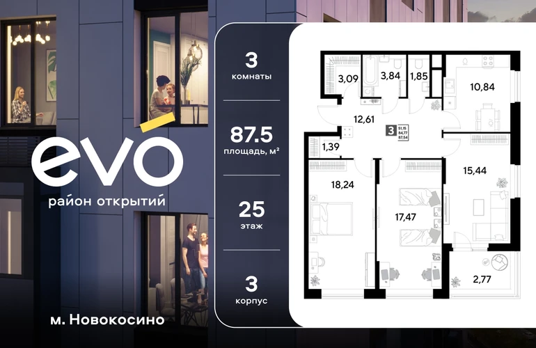 Продается трекомнатная квартира 87.54 кв.м. в жилом комплексе ЭВО на 25 этаже по адресу: Московская область, г. Реутов, ул. Комсомольская. Скидка 15% на выделенный пул двухкомнатных и трёхкомнатных квартир с готовностью в 2026 году!* ЭВО - проект комфорт-класса от девелопера Dogma. Каждый житель сможет открыть для себя максимум возможностей. Совершенствоваться во всех направлениях: физическом, эмоциональном и материальном. В ЭВО можно открыть для себя новые виды спорта, найти единомышленников по хобби, партнеров по бизнесу, развивать в детях новые грани, наслаждаться природой и лаконичной архитектурой. Более 6 га благоустройства в первой очереди! - Зеленый двор без машин, кленовая аллея для прогулок. - Нейродинамические площадки для детей разных возрастов. - Workout зона, столы для пинг-понга, места для занятия йогой. велодорожки и дорожки для скандинавской ходьбы. - Детский сад на 180 мест и школа на 750 мест. - Кроссбукинг. - Лобби с зоной ожидания, колясочной и лапомойкой. - Магазины и кафе на первых этажах. БЕЗОПАСНОСТЬ - Закрытая территория. - Круглосуточное видеонаблюдение. - Контроль доступа. РАСПОЛОЖЕНИЕ Пешком - 7 минут до станции Реутов. - 20 минут до метро Новокосино. На машине - 4 минуты до МКАД. - 6 минут до шоссе Энтузиастов. - 9 минут до Носовихинское шоссе. - 13 минут до МСД (Московский скоростной диаметр). СОЦИАЛЬНАЯ ИНФРАСТРУКТУРА В первой очереди предусмотрено строительство детского сада на 180 мест и школы на 750 учащихся. В 10 минутах ходьбы от ЭВО находится детский технопарк "Изобретариум", в котором более 60 научных секции: от IT до промышленного дизайна. Для творческих ребят рядом есть художественная и музыкальные школы, хоровая студия. ОКРУЖЕНИЕ - Реутовский центральный парк, Александровский сквер, Фабричный пруд. - ТЦ "Экватор", ТК "Шоколад". - Спортивный комплекс "Старт", Ледовый комплекс "Реутов Арена". - Музей-усадьба "Кусково". *Акция действует до 15.02.2026. Подробности уточняйте по телефону.О застройщике