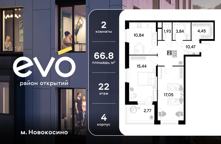 Продается двухкомнатная квартира 66.79 кв.м. в жилом комплексе ЭВО на 22 этаже по адресу: Московская область, г. Реутов, ул. Комсомольская. Скидка 15% на выделенный пул двухкомнатных и трёхкомнатных квартир с готовностью в 2026 году!* ЭВО - проект комфорт-класса от девелопера Dogma. Каждый житель сможет открыть для себя максимум возможностей. Совершенствоваться во всех направлениях: физическом, эмоциональном и материальном. В ЭВО можно открыть для себя новые виды спорта, найти единомышленников по хобби, партнеров по бизнесу, развивать в детях новые грани, наслаждаться природой и лаконичной архитектурой. Более 6 га благоустройства в первой очереди! - Зеленый двор без машин, кленовая аллея для прогулок. - Нейродинамические площадки для детей разных возрастов. - Workout зона, столы для пинг-понга, места для занятия йогой. велодорожки и дорожки для скандинавской ходьбы. - Детский сад на 180 мест и школа на 750 мест. - Кроссбукинг. - Лобби с зоной ожидания, колясочной и лапомойкой. - Магазины и кафе на первых этажах. БЕЗОПАСНОСТЬ - Закрытая территория. - Круглосуточное видеонаблюдение. - Контроль доступа. РАСПОЛОЖЕНИЕ Пешком - 7 минут до станции Реутов. - 20 минут до метро Новокосино. На машине - 4 минуты до МКАД. - 6 минут до шоссе Энтузиастов. - 9 минут до Носовихинское шоссе. - 13 минут до МСД (Московский скоростной диаметр). СОЦИАЛЬНАЯ ИНФРАСТРУКТУРА В первой очереди предусмотрено строительство детского сада на 180 мест и школы на 750 учащихся. В 10 минутах ходьбы от ЭВО находится детский технопарк "Изобретариум", в котором более 60 научных секции: от IT до промышленного дизайна. Для творческих ребят рядом есть художественная и музыкальные школы, хоровая студия. ОКРУЖЕНИЕ - Реутовский центральный парк, Александровский сквер, Фабричный пруд. - ТЦ "Экватор", ТК "Шоколад". - Спортивный комплекс "Старт", Ледовый комплекс "Реутов Арена". - Музей-усадьба "Кусково". *Акция действует до 15.02.2026. Подробности уточняйте по телефону.О застройщике