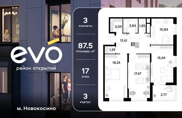Продается трекомнатная квартира 87.54 кв.м. в жилом комплексе ЭВО на 17 этаже по адресу: Московская область, г. Реутов, ул. Комсомольская. Скидка 15% на выделенный пул двухкомнатных и трёхкомнатных квартир с готовностью в 2026 году!* ЭВО - проект комфорт-класса от девелопера Dogma. Каждый житель сможет открыть для себя максимум возможностей. Совершенствоваться во всех направлениях: физическом, эмоциональном и материальном. В ЭВО можно открыть для себя новые виды спорта, найти единомышленников по хобби, партнеров по бизнесу, развивать в детях новые грани, наслаждаться природой и лаконичной архитектурой. Более 6 га благоустройства в первой очереди! - Зеленый двор без машин, кленовая аллея для прогулок. - Нейродинамические площадки для детей разных возрастов. - Workout зона, столы для пинг-понга, места для занятия йогой. велодорожки и дорожки для скандинавской ходьбы. - Детский сад на 180 мест и школа на 750 мест. - Кроссбукинг. - Лобби с зоной ожидания, колясочной и лапомойкой. - Магазины и кафе на первых этажах. БЕЗОПАСНОСТЬ - Закрытая территория. - Круглосуточное видеонаблюдение. - Контроль доступа. РАСПОЛОЖЕНИЕ Пешком - 7 минут до станции Реутов. - 20 минут до метро Новокосино. На машине - 4 минуты до МКАД. - 6 минут до шоссе Энтузиастов. - 9 минут до Носовихинское шоссе. - 13 минут до МСД (Московский скоростной диаметр). СОЦИАЛЬНАЯ ИНФРАСТРУКТУРА В первой очереди предусмотрено строительство детского сада на 180 мест и школы на 750 учащихся. В 10 минутах ходьбы от ЭВО находится детский технопарк "Изобретариум", в котором более 60 научных секции: от IT до промышленного дизайна. Для творческих ребят рядом есть художественная и музыкальные школы, хоровая студия. ОКРУЖЕНИЕ - Реутовский центральный парк, Александровский сквер, Фабричный пруд. - ТЦ "Экватор", ТК "Шоколад". - Спортивный комплекс "Старт", Ледовый комплекс "Реутов Арена". - Музей-усадьба "Кусково". *Акция действует до 15.02.2026. Подробности уточняйте по телефону.О застройщике