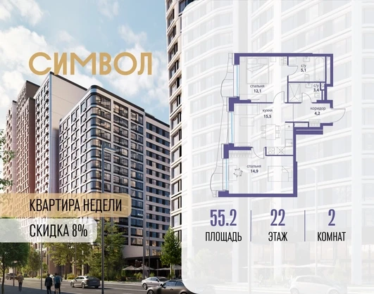 Продается 2-комнатная квартира от застройщика: общая площадь 55.20 м², жилая 27.00 м², кухня 15.50 м², 22-й этаж, жилой квартал «Вдохновение», корпус 34 (секция 1). Срок сдачи: 4 квартал 2027 года. Позвоните сейчас и забронируйте квартиру! Квартал бизнес-класса СИМВОЛ — это городское пространство нового поколения в историческом районе Лефортово, на границе ЦАО, в 2 км от Садового кольца. Бионическая архитектура СИМВОЛА превратила Лефортово в суперсовременное и модное пространство. Из окон, с балконов и террас просторных квартир СИМВОЛА открываются отличные виды на город и новый парк «Зеленая река», «протекающий» через все кварталы комплекса на 2 км. В квартале уже есть все, что нужно для комфортной жизни: кафе и рестораны, супермаркеты и магазины, медицинские и физкультурно-оздоровительные центры, салоны красоты и барбершопы, аптеки и оптики, химчистки, пункты доставки и другие сервисы — всего более 90 действующих объектов внутриквартальной инфраструктуры. Для юных жителей СИМВОЛА открыты детский сад и инженерный лицей при МГТУ им. Баумана. Особенности квартала: • Свой парк «Зеленая Река» - 10 га зелени и развлечений на любой вкус! • Уникальная для Москвы архитектура - Проект создан архитектурной мастерской ATRIUM по дизайн-коду британских бюро LDA Design и UHA London. • Богатая инфраструктура с детскими садами и лицеем им. Баумана, кафе и ресторанами, супермаркетами и аптеками, зоной для фитнеса, бассейном и мед. центром. • Квартиры с панорамными окнами, террасами, ванными с окнами и каминами редких форматов. • Закрытые безопасные зелёные дворы-парки без машин!О застройщике