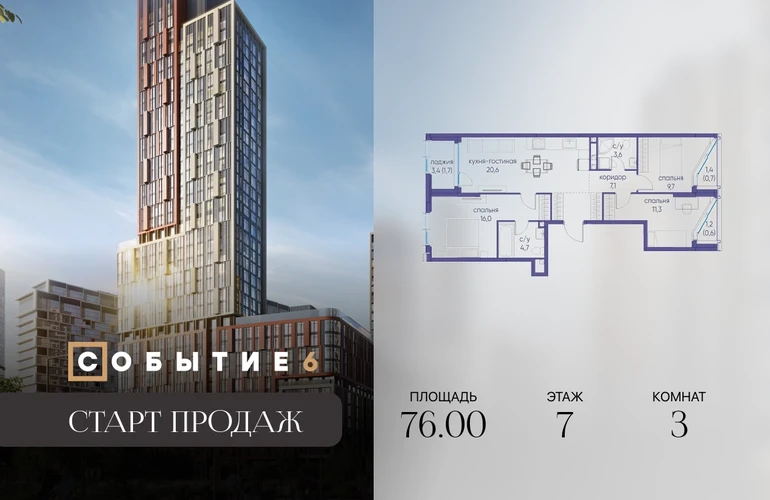 Продаётся 3-комнатная квартира от застройщика: общая площадь 76.00 м², жилая 37.00 м², кухня 20.60 м², 7-й этаж, жилой квартал «Событие-6», корпус 2 (секция 4) Срок сдачи: 1 квартал 2029 года. Позвоните сейчас и забронируйте квартиру! Продуманный до деталей. Созданный для жизни, полной счастливых событий. Парк-квартал СОБЫТИЕ — это жизнь класса премиум в престижном районе на Мосфильмовской улице. Архитектура мирового уровня. Выигрышное расположение на границе природного комплекса «Долина реки Раменки». Все для комфортной жизни и досуга: от детсадов и школ до ресторанов и медцентров. И новая точка притяжения — уже готовый парк «Событие» с пространствами активности для всех возрастов и интересов. Особенности квартала: • «Парящие» мосты и парк под облаками - уникальный дом с самыми завораживающими видами из окон «в пол» • Собственный парк — сразу за порогом! • Архитектурная концепция от известных международных бюро LDA Design и UHA London • Инфраструктура «тапочной доступности»: в кафе, школу, магазин — за пару минут! • Внутренний двор — настоящее продолжение вашего дома: закрытая охраняемая территория без машин, развивающие детские площадки, воркауты-зоны для тех, кто хочет быть в форме, площади для праздников и посиделок с соседями.О застройщике