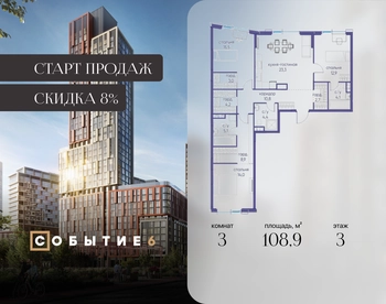 Продаётся 3-комнатная квартира от застройщика: общая площадь 108.90 м², жилая 42.40 м², кухня 23.30 м², 3-й этаж, жилой квартал «Событие-6», корпус 2 (секция 4) Срок сдачи: 1 квартал 2029 года. Позвоните сейчас и забронируйте квартиру! Продуманный до деталей. Созданный для жизни, полной счастливых событий. Парк-квартал СОБЫТИЕ — это жизнь класса премиум в престижном районе на Мосфильмовской улице. Архитектура мирового уровня. Выигрышное расположение на границе природного комплекса «Долина реки Раменки». Все для комфортной жизни и досуга: от детсадов и школ до ресторанов и медцентров. И новая точка притяжения — уже готовый парк «Событие» с пространствами активности для всех возрастов и интересов. Особенности квартала: • «Парящие» мосты и парк под облаками - уникальный дом с самыми завораживающими видами из окон «в пол» • Собственный парк — сразу за порогом! • Архитектурная концепция от известных международных бюро LDA Design и UHA London • Инфраструктура «тапочной доступности»: в кафе, школу, магазин — за пару минут! • Внутренний двор — настоящее продолжение вашего дома: закрытая охраняемая территория без машин, развивающие детские площадки, воркауты-зоны для тех, кто хочет быть в форме, площади для праздников и посиделок с соседями.О застройщике
