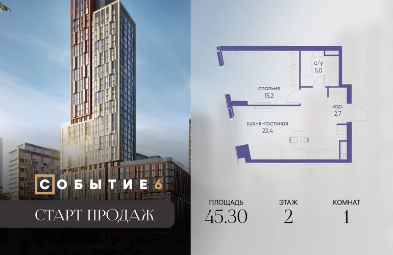 Продаётся 1-комнатная квартира от застройщика: общая площадь 45.30 м², жилая 15.20 м², кухня 22.40 м², 2-й этаж, жилой квартал «Событие-6», корпус 2 (секция 1) Срок сдачи: 1 квартал 2029 года. Позвоните сейчас и забронируйте квартиру! Продуманный до деталей. Созданный для жизни, полной счастливых событий. Парк-квартал СОБЫТИЕ — это жизнь класса премиум в престижном районе на Мосфильмовской улице. Архитектура мирового уровня. Выигрышное расположение на границе природного комплекса «Долина реки Раменки». Все для комфортной жизни и досуга: от детсадов и школ до ресторанов и медцентров. И новая точка притяжения — уже готовый парк «Событие» с пространствами активности для всех возрастов и интересов. Особенности квартала: • «Парящие» мосты и парк под облаками - уникальный дом с самыми завораживающими видами из окон «в пол» • Собственный парк — сразу за порогом! • Архитектурная концепция от известных международных бюро LDA Design и UHA London • Инфраструктура «тапочной доступности»: в кафе, школу, магазин — за пару минут! • Внутренний двор — настоящее продолжение вашего дома: закрытая охраняемая территория без машин, развивающие детские площадки, воркауты-зоны для тех, кто хочет быть в форме, площади для праздников и посиделок с соседями.О застройщике