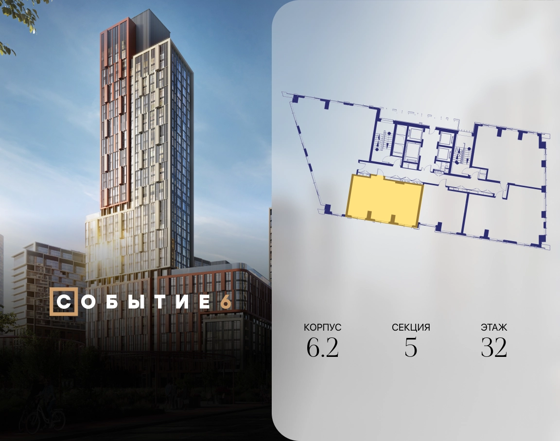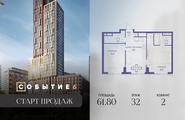 Продаётся 2-комнатная квартира от застройщика: общая площадь 61.80 м², жилая 32.90 м², кухня 17.80 м², 32-й этаж, жилой квартал «Событие-6», корпус 2 (секция 5) Срок сдачи: 1 квартал 2029 года. Позвоните сейчас и забронируйте квартиру! Продуманный до деталей. Созданный для жизни, полной счастливых событий. Парк-квартал СОБЫТИЕ — это жизнь класса премиум в престижном районе на Мосфильмовской улице. Архитектура мирового уровня. Выигрышное расположение на границе природного комплекса «Долина реки Раменки». Все для комфортной жизни и досуга: от детсадов и школ до ресторанов и медцентров. И новая точка притяжения — уже готовый парк «Событие» с пространствами активности для всех возрастов и интересов. Особенности квартала: • «Парящие» мосты и парк под облаками - уникальный дом с самыми завораживающими видами из окон «в пол» • Собственный парк — сразу за порогом! • Архитектурная концепция от известных международных бюро LDA Design и UHA London • Инфраструктура «тапочной доступности»: в кафе, школу, магазин — за пару минут! • Внутренний двор — настоящее продолжение вашего дома: закрытая охраняемая территория без машин, развивающие детские площадки, воркауты-зоны для тех, кто хочет быть в форме, площади для праздников и посиделок с соседями.О застройщике