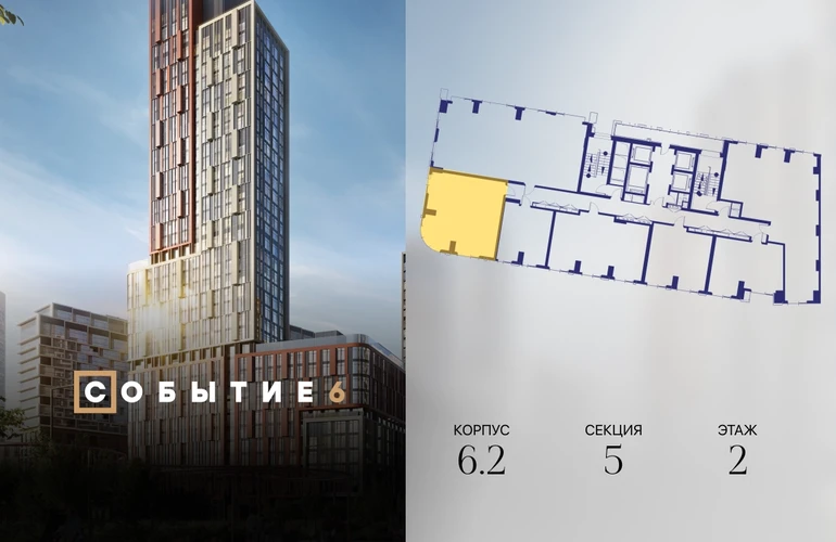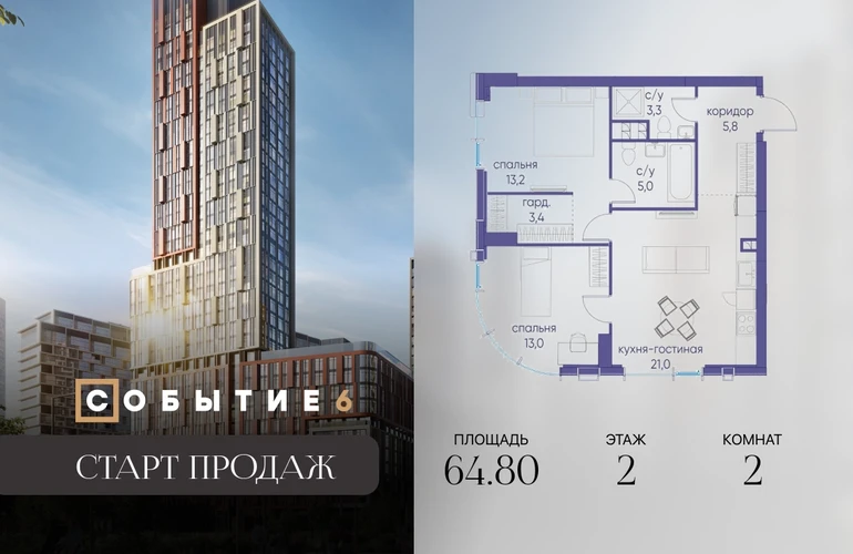 Продаётся 2-комнатная квартира от застройщика: общая площадь 64.80 м², жилая 26.20 м², кухня 21.00 м², 2-й этаж, жилой квартал «Событие-6», корпус 2 (секция 5) Срок сдачи: 1 квартал 2029 года. Позвоните сейчас и забронируйте квартиру! Продуманный до деталей. Созданный для жизни, полной счастливых событий. Парк-квартал СОБЫТИЕ — это жизнь класса премиум в престижном районе на Мосфильмовской улице. Архитектура мирового уровня. Выигрышное расположение на границе природного комплекса «Долина реки Раменки». Все для комфортной жизни и досуга: от детсадов и школ до ресторанов и медцентров. И новая точка притяжения — уже готовый парк «Событие» с пространствами активности для всех возрастов и интересов. Особенности квартала: • «Парящие» мосты и парк под облаками - уникальный дом с самыми завораживающими видами из окон «в пол» • Собственный парк — сразу за порогом! • Архитектурная концепция от известных международных бюро LDA Design и UHA London • Инфраструктура «тапочной доступности»: в кафе, школу, магазин — за пару минут! • Внутренний двор — настоящее продолжение вашего дома: закрытая охраняемая территория без машин, развивающие детские площадки, воркауты-зоны для тех, кто хочет быть в форме, площади для праздников и посиделок с соседями.О застройщике