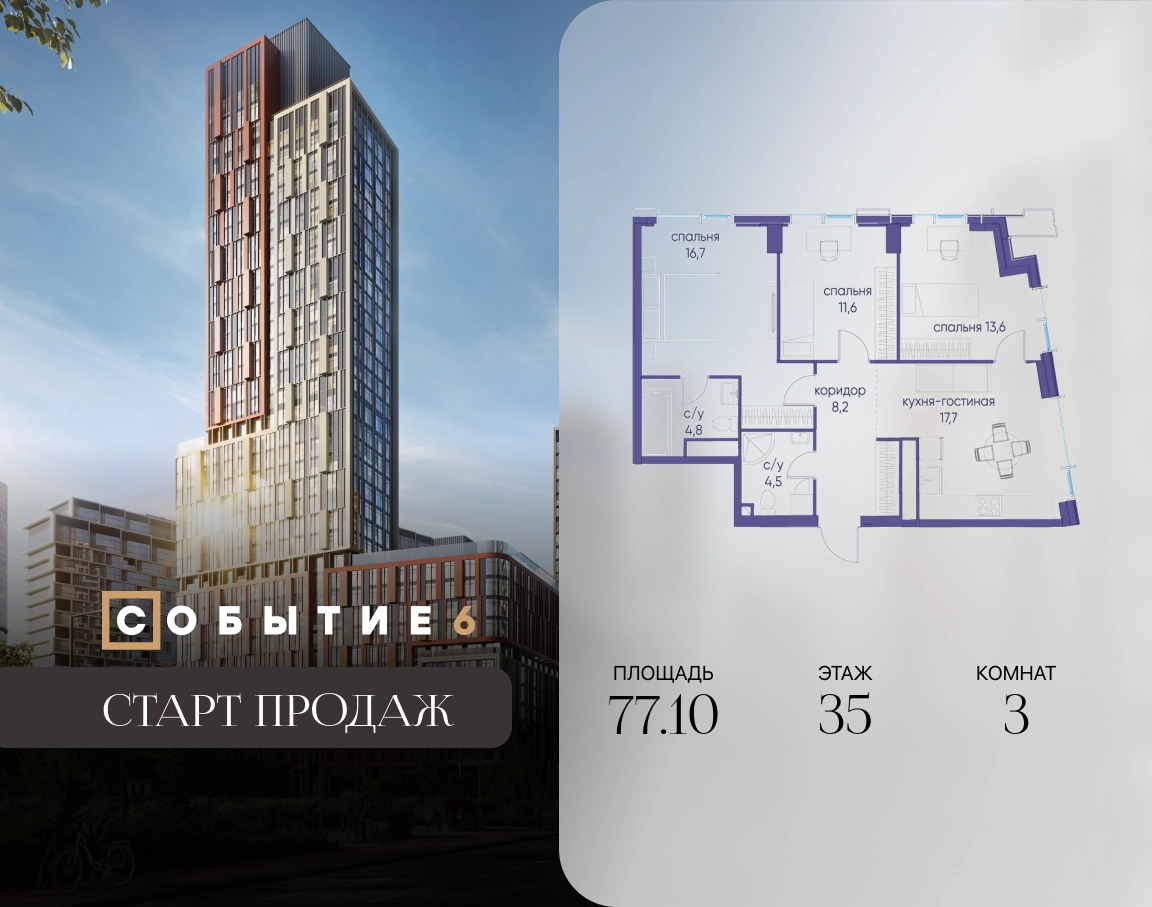 Продаётся 3-комнатная квартира от застройщика: общая площадь 77.10 м², жилая 41.90 м², кухня 17.70 м², 35-й этаж, жилой квартал «Событие-6», корпус 2 (секция 5) Срок сдачи: 1 квартал 2029 года. Позвоните сейчас и забронируйте квартиру! Продуманный до деталей. Созданный для жизни, полной счастливых событий. Парк-квартал СОБЫТИЕ — это жизнь класса премиум в престижном районе на Мосфильмовской улице. Архитектура мирового уровня. Выигрышное расположение на границе природного комплекса «Долина реки Раменки». Все для комфортной жизни и досуга: от детсадов и школ до ресторанов и медцентров. И новая точка притяжения — уже готовый парк «Событие» с пространствами активности для всех возрастов и интересов. Особенности квартала: • «Парящие» мосты и парк под облаками - уникальный дом с самыми завораживающими видами из окон «в пол» • Собственный парк — сразу за порогом! • Архитектурная концепция от известных международных бюро LDA Design и UHA London • Инфраструктура «тапочной доступности»: в кафе, школу, магазин — за пару минут! • Внутренний двор — настоящее продолжение вашего дома: закрытая охраняемая территория без машин, развивающие детские площадки, воркауты-зоны для тех, кто хочет быть в форме, площади для праздников и посиделок с соседями.О застройщике