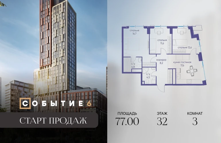 Продаётся 3-комнатная квартира от застройщика: общая площадь 77.00 м², жилая 41.90 м², кухня 17.60 м², 32-й этаж, жилой квартал «Событие-6», корпус 2 (секция 5) Срок сдачи: 1 квартал 2029 года. Позвоните сейчас и забронируйте квартиру! Продуманный до деталей. Созданный для жизни, полной счастливых событий. Парк-квартал СОБЫТИЕ — это жизнь класса премиум в престижном районе на Мосфильмовской улице. Архитектура мирового уровня. Выигрышное расположение на границе природного комплекса «Долина реки Раменки». Все для комфортной жизни и досуга: от детсадов и школ до ресторанов и медцентров. И новая точка притяжения — уже готовый парк «Событие» с пространствами активности для всех возрастов и интересов. Особенности квартала: • «Парящие» мосты и парк под облаками - уникальный дом с самыми завораживающими видами из окон «в пол» • Собственный парк — сразу за порогом! • Архитектурная концепция от известных международных бюро LDA Design и UHA London • Инфраструктура «тапочной доступности»: в кафе, школу, магазин — за пару минут! • Внутренний двор — настоящее продолжение вашего дома: закрытая охраняемая территория без машин, развивающие детские площадки, воркауты-зоны для тех, кто хочет быть в форме, площади для праздников и посиделок с соседями.О застройщике