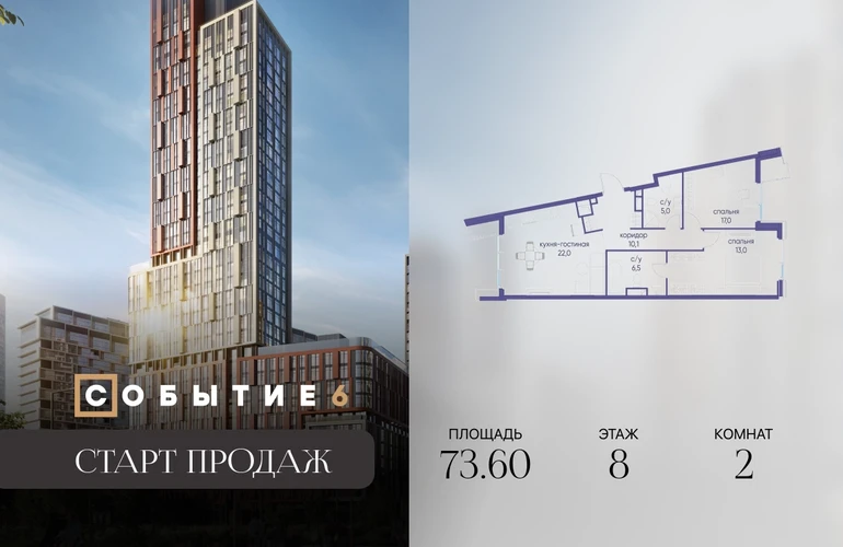 Продаётся 2-комнатная квартира от застройщика: общая площадь 73.60 м², жилая 30.00 м², кухня 22.00 м², 8-й этаж, жилой квартал «Событие-6», корпус 2 (секция 1) Срок сдачи: 1 квартал 2029 года. Позвоните сейчас и забронируйте квартиру! Продуманный до деталей. Созданный для жизни, полной счастливых событий. Парк-квартал СОБЫТИЕ — это жизнь класса премиум в престижном районе на Мосфильмовской улице. Архитектура мирового уровня. Выигрышное расположение на границе природного комплекса «Долина реки Раменки». Все для комфортной жизни и досуга: от детсадов и школ до ресторанов и медцентров. И новая точка притяжения — уже готовый парк «Событие» с пространствами активности для всех возрастов и интересов. Особенности квартала: • «Парящие» мосты и парк под облаками - уникальный дом с самыми завораживающими видами из окон «в пол» • Собственный парк — сразу за порогом! • Архитектурная концепция от известных международных бюро LDA Design и UHA London • Инфраструктура «тапочной доступности»: в кафе, школу, магазин — за пару минут! • Внутренний двор — настоящее продолжение вашего дома: закрытая охраняемая территория без машин, развивающие детские площадки, воркауты-зоны для тех, кто хочет быть в форме, площади для праздников и посиделок с соседями.О застройщике