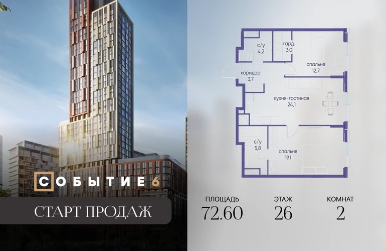 Продаётся 2-комнатная квартира от застройщика: общая площадь 72.60 м², жилая 31.80 м², кухня 24.10 м², 26-й этаж, жилой квартал «Событие-6», корпус 2 (секция 1) Срок сдачи: 1 квартал 2029 года. Позвоните сейчас и забронируйте квартиру! Продуманный до деталей. Созданный для жизни, полной счастливых событий. Парк-квартал СОБЫТИЕ — это жизнь класса премиум в престижном районе на Мосфильмовской улице. Архитектура мирового уровня. Выигрышное расположение на границе природного комплекса «Долина реки Раменки». Все для комфортной жизни и досуга: от детсадов и школ до ресторанов и медцентров. И новая точка притяжения — уже готовый парк «Событие» с пространствами активности для всех возрастов и интересов. Особенности квартала: • «Парящие» мосты и парк под облаками - уникальный дом с самыми завораживающими видами из окон «в пол» • Собственный парк — сразу за порогом! • Архитектурная концепция от известных международных бюро LDA Design и UHA London • Инфраструктура «тапочной доступности»: в кафе, школу, магазин — за пару минут! • Внутренний двор — настоящее продолжение вашего дома: закрытая охраняемая территория без машин, развивающие детские площадки, воркауты-зоны для тех, кто хочет быть в форме, площади для праздников и посиделок с соседями.О застройщике