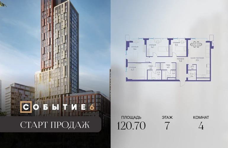 Продаётся 4-комнатная квартира от застройщика: общая площадь 120.70 м², жилая 55.60 м², кухня 27.50 м², 7-й этаж, жилой квартал «Событие-6», корпус 2 (секция 5) Срок сдачи: 1 квартал 2029 года. Позвоните сейчас и забронируйте квартиру! Продуманный до деталей. Созданный для жизни, полной счастливых событий. Парк-квартал СОБЫТИЕ — это жизнь класса премиум в престижном районе на Мосфильмовской улице. Архитектура мирового уровня. Выигрышное расположение на границе природного комплекса «Долина реки Раменки». Все для комфортной жизни и досуга: от детсадов и школ до ресторанов и медцентров. И новая точка притяжения — уже готовый парк «Событие» с пространствами активности для всех возрастов и интересов. Особенности квартала: • «Парящие» мосты и парк под облаками - уникальный дом с самыми завораживающими видами из окон «в пол» • Собственный парк — сразу за порогом! • Архитектурная концепция от известных международных бюро LDA Design и UHA London • Инфраструктура «тапочной доступности»: в кафе, школу, магазин — за пару минут! • Внутренний двор — настоящее продолжение вашего дома: закрытая охраняемая территория без машин, развивающие детские площадки, воркауты-зоны для тех, кто хочет быть в форме, площади для праздников и посиделок с соседями.О застройщике