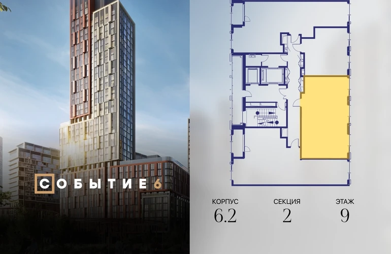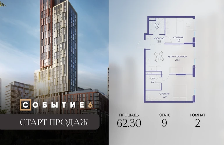 Продаётся 2-комнатная квартира от застройщика: общая площадь 62.30 м², жилая 28.80 м², кухня 22.10 м², 9-й этаж, жилой квартал «Событие-6», корпус 2 (секция 2) Срок сдачи: 1 квартал 2029 года. Позвоните сейчас и забронируйте квартиру! Продуманный до деталей. Созданный для жизни, полной счастливых событий. Парк-квартал СОБЫТИЕ — это жизнь класса премиум в престижном районе на Мосфильмовской улице. Архитектура мирового уровня. Выигрышное расположение на границе природного комплекса «Долина реки Раменки». Все для комфортной жизни и досуга: от детсадов и школ до ресторанов и медцентров. И новая точка притяжения — уже готовый парк «Событие» с пространствами активности для всех возрастов и интересов. Особенности квартала: • «Парящие» мосты и парк под облаками - уникальный дом с самыми завораживающими видами из окон «в пол» • Собственный парк — сразу за порогом! • Архитектурная концепция от известных международных бюро LDA Design и UHA London • Инфраструктура «тапочной доступности»: в кафе, школу, магазин — за пару минут! • Внутренний двор — настоящее продолжение вашего дома: закрытая охраняемая территория без машин, развивающие детские площадки, воркауты-зоны для тех, кто хочет быть в форме, площади для праздников и посиделок с соседями.О застройщике