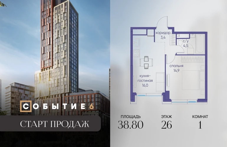 Продаётся 1-комнатная квартира от застройщика: общая площадь 38.80 м², жилая 14.90 м², кухня 16.00 м², 26-й этаж, жилой квартал «Событие-6», корпус 2 (секция 5) Срок сдачи: 1 квартал 2029 года. Позвоните сейчас и забронируйте квартиру! Продуманный до деталей. Созданный для жизни, полной счастливых событий. Парк-квартал СОБЫТИЕ — это жизнь класса премиум в престижном районе на Мосфильмовской улице. Архитектура мирового уровня. Выигрышное расположение на границе природного комплекса «Долина реки Раменки». Все для комфортной жизни и досуга: от детсадов и школ до ресторанов и медцентров. И новая точка притяжения — уже готовый парк «Событие» с пространствами активности для всех возрастов и интересов. Особенности квартала: • «Парящие» мосты и парк под облаками - уникальный дом с самыми завораживающими видами из окон «в пол» • Собственный парк — сразу за порогом! • Архитектурная концепция от известных международных бюро LDA Design и UHA London • Инфраструктура «тапочной доступности»: в кафе, школу, магазин — за пару минут! • Внутренний двор — настоящее продолжение вашего дома: закрытая охраняемая территория без машин, развивающие детские площадки, воркауты-зоны для тех, кто хочет быть в форме, площади для праздников и посиделок с соседями.О застройщике