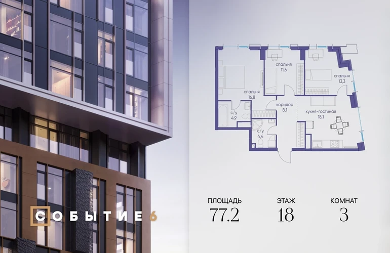 Продаётся 3-комнатная квартира от застройщика: общая площадь 77.20 м², жилая 41.70 м², кухня 18.10 м², 18-й этаж, жилой квартал «Событие-6», корпус 2 (секция 5) Срок сдачи: 4 квартал 2029 года. Позвоните сейчас и забронируйте квартиру! Продуманный до деталей. Созданный для жизни, полной счастливых событий. Парк-квартал СОБЫТИЕ — это жизнь класса премиум в престижном районе на Мосфильмовской улице. Архитектура мирового уровня. Выигрышное расположение на границе природного комплекса «Долина реки Раменки». Все для комфортной жизни и досуга: от детсадов и школ до ресторанов и медцентров. И новая точка притяжения — уже готовый парк «Событие» с пространствами активности для всех возрастов и интересов. Особенности квартала: • «Парящие» мосты и парк под облаками - уникальный дом с самыми завораживающими видами из окон «в пол» • Собственный парк — сразу за порогом! • Архитектурная концепция от известных международных бюро LDA Design и UHA London • Инфраструктура «тапочной доступности»: в кафе, школу, магазин — за пару минут! • Внутренний двор — настоящее продолжение вашего дома: закрытая охраняемая территория без машин, развивающие детские площадки, воркауты-зоны для тех, кто хочет быть в форме, площади для праздников и посиделок с соседями.О застройщике