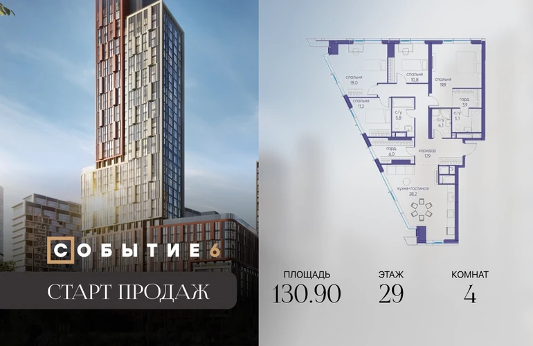 Продаётся 4-комнатная квартира от застройщика: общая площадь 130.90 м², жилая 59.90 м², кухня 28.20 м², 29-й этаж, жилой квартал «Событие-6», корпус 2 (секция 5) Срок сдачи: 4 квартал 2029 года. Позвоните сейчас и забронируйте квартиру! Продуманный до деталей. Созданный для жизни, полной счастливых событий. Парк-квартал СОБЫТИЕ — это жизнь класса премиум в престижном районе на Мосфильмовской улице. Архитектура мирового уровня. Выигрышное расположение на границе природного комплекса «Долина реки Раменки». Все для комфортной жизни и досуга: от детсадов и школ до ресторанов и медцентров. И новая точка притяжения — уже готовый парк «Событие» с пространствами активности для всех возрастов и интересов. Особенности квартала: • «Парящие» мосты и парк под облаками - уникальный дом с самыми завораживающими видами из окон «в пол» • Собственный парк — сразу за порогом! • Архитектурная концепция от известных международных бюро LDA Design и UHA London • Инфраструктура «тапочной доступности»: в кафе, школу, магазин — за пару минут! • Внутренний двор — настоящее продолжение вашего дома: закрытая охраняемая территория без машин, развивающие детские площадки, воркауты-зоны для тех, кто хочет быть в форме, площади для праздников и посиделок с соседями.О застройщике