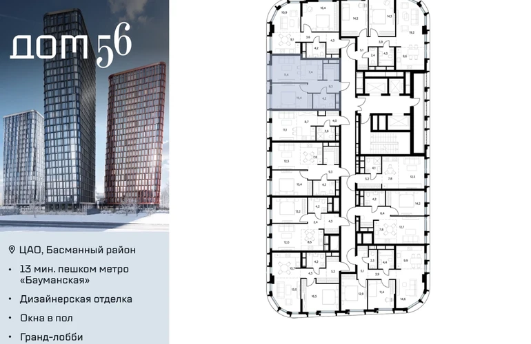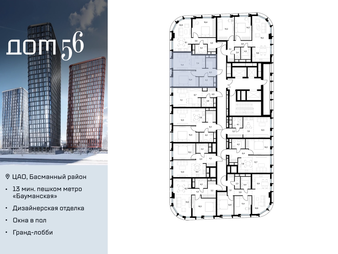 В премиум-квартале «Дом 56» на Бауманской напрямую от девелопера ГК «Галс-Девелопмент» представлена 1-комнатная квартира на 19 этаже общей площадью 46.70 м². Квартира предлагается без отделки, со свободной планировкой. Пространство позволяет воплотить дизайн - проект в соответствии с Вашими предпочтениями. «Дом 56» — расположен в Басманном районе на ул. Фридриха Энгельса, всего в 12-15 минутах пешком от станций метро «Бауманская» и «Электрозаводская». Рядом с премиум-кварталом находятся важные городские магистрали — ТТК, набережная реки Яузы и Бакунинская улица, переходящая в Спартаковскую и Маросейку. Архитектурный стиль «Дома 56» — параметрический минимализм. Футуристические фасады квартала с «эффектом закручивания» словно вращаются вокруг своей оси. Динамичный образ башен дополняет эффектное остекление — окна в пол будут в каждой квартире. «Дом 56» станет органичным продолжением современной научно-креативной среды Басманного района: — Развитое окружение — десятки различных точек притяжения; — Близость престижных вузов: МГТУ, МЭИ и Британская высшая школа дизайна; — Соседство с Технологической долиной и всем необходимым для запуска стартапа; — Набережные и парки для спорта и отдыха. «Дом 56» оснащён первоклассными инженерными системами. Входы на территорию, в здание и паркинг оборудованы системой контроля и управления доступом. С любого этажа в лобби и паркинг спускаются быстрые и бесшумные лифты премиального бренда. Во внутреннем приватном дворе будет создано пространство в бионическом стиле с лаунж-зонами, подвесными качелями, детскими плейхабами для разных возрастов, площадками для спорта и отдыха в окружении зелени. На двух подземных уровнях предусмотрен подземный паркинг и кладовые помещения.О застройщике