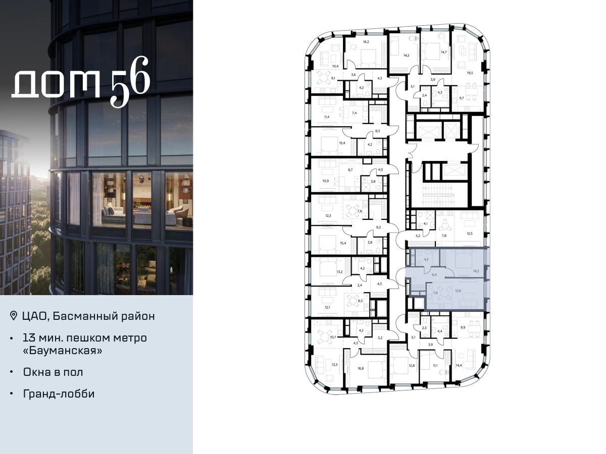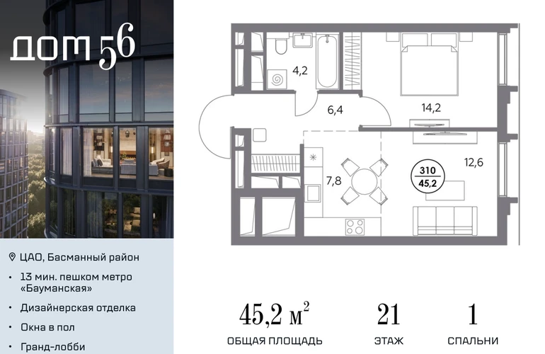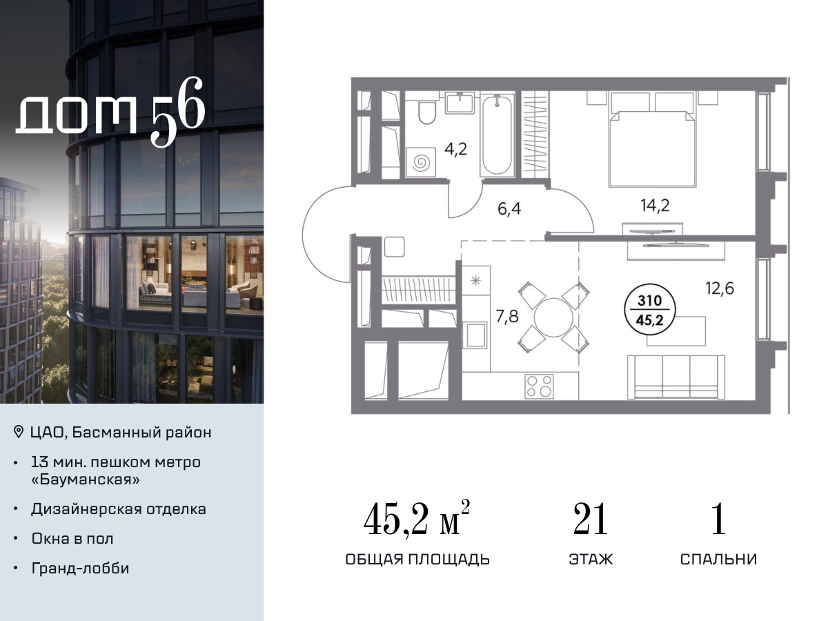 В премиум-квартале «Дом 56» на Бауманской напрямую от девелопера ГК «Галс-Девелопмент» представлена 1-комнатная квартира на 21 этаже общей площадью 45.20 м². Квартира предлагается без отделки, со свободной планировкой. Пространство позволяет воплотить дизайн - проект в соответствии с Вашими предпочтениями. «Дом 56» — расположен в Басманном районе на ул. Фридриха Энгельса, всего в 12-15 минутах пешком от станций метро «Бауманская» и «Электрозаводская». Рядом с премиум-кварталом находятся важные городские магистрали — ТТК, набережная реки Яузы и Бакунинская улица, переходящая в Спартаковскую и Маросейку. Архитектурный стиль «Дома 56» — параметрический минимализм. Футуристические фасады квартала с «эффектом закручивания» словно вращаются вокруг своей оси. Динамичный образ башен дополняет эффектное остекление — окна в пол будут в каждой квартире. «Дом 56» станет органичным продолжением современной научно-креативной среды Басманного района: — Развитое окружение — десятки различных точек притяжения; — Близость престижных вузов: МГТУ, МЭИ и Британская высшая школа дизайна; — Соседство с Технологической долиной и всем необходимым для запуска стартапа; — Набережные и парки для спорта и отдыха. «Дом 56» оснащён первоклассными инженерными системами. Входы на территорию, в здание и паркинг оборудованы системой контроля и управления доступом. С любого этажа в лобби и паркинг спускаются быстрые и бесшумные лифты премиального бренда. Во внутреннем приватном дворе будет создано пространство в бионическом стиле с лаунж-зонами, подвесными качелями, детскими плейхабами для разных возрастов, площадками для спорта и отдыха в окружении зелени. На двух подземных уровнях предусмотрен подземный паркинг и кладовые помещения.О застройщике