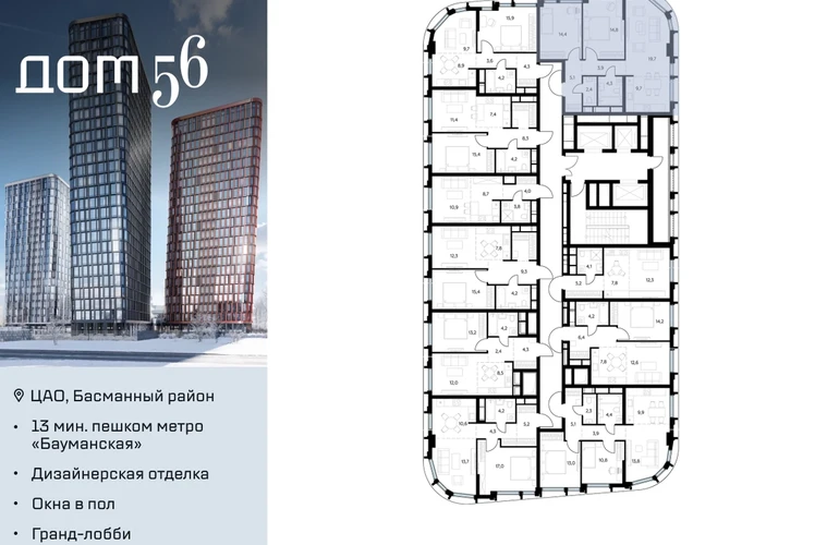 В премиум-квартале «Дом 56» на Бауманской напрямую от девелопера ГК «Галс-Девелопмент» представлена 2-комнатная квартира на 23 этаже общей площадью 74.30 м². Квартира предлагается без отделки, со свободной планировкой. Пространство позволяет воплотить дизайн - проект в соответствии с Вашими предпочтениями. «Дом 56» — расположен в Басманном районе на ул. Фридриха Энгельса, всего в 12-15 минутах пешком от станций метро «Бауманская» и «Электрозаводская». Рядом с премиум-кварталом находятся важные городские магистрали — ТТК, набережная реки Яузы и Бакунинская улица, переходящая в Спартаковскую и Маросейку. Архитектурный стиль «Дома 56» — параметрический минимализм. Футуристические фасады квартала с «эффектом закручивания» словно вращаются вокруг своей оси. Динамичный образ башен дополняет эффектное остекление — окна в пол будут в каждой квартире. «Дом 56» станет органичным продолжением современной научно-креативной среды Басманного района: — Развитое окружение — десятки различных точек притяжения; — Близость престижных вузов: МГТУ, МЭИ и Британская высшая школа дизайна; — Соседство с Технологической долиной и всем необходимым для запуска стартапа; — Набережные и парки для спорта и отдыха. «Дом 56» оснащён первоклассными инженерными системами. Входы на территорию, в здание и паркинг оборудованы системой контроля и управления доступом. С любого этажа в лобби и паркинг спускаются быстрые и бесшумные лифты премиального бренда. Во внутреннем приватном дворе будет создано пространство в бионическом стиле с лаунж-зонами, подвесными качелями, детскими плейхабами для разных возрастов, площадками для спорта и отдыха в окружении зелени. На двух подземных уровнях предусмотрен подземный паркинг и кладовые помещения.О застройщике