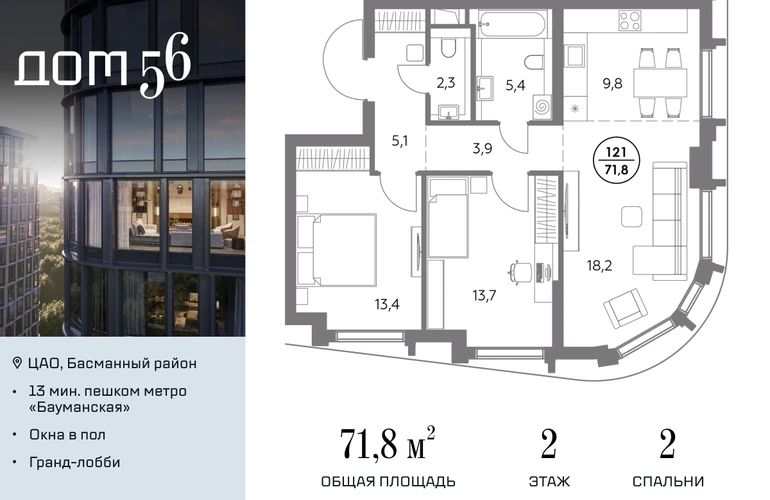 В премиум-квартале «Дом 56» на Бауманской напрямую от девелопера ГК «Галс-Девелопмент» представлена 2-комнатная квартира на 2 этаже общей площадью 71.80 м². Квартира предлагается без отделки, со свободной планировкой. Пространство позволяет воплотить дизайн - проект в соответствии с Вашими предпочтениями. «Дом 56» — расположен в Басманном районе на ул. Фридриха Энгельса, всего в 12-15 минутах пешком от станций метро «Бауманская» и «Электрозаводская». Рядом с премиум-кварталом находятся важные городские магистрали — ТТК, набережная реки Яузы и Бакунинская улица, переходящая в Спартаковскую и Маросейку. Архитектурный стиль «Дома 56» — параметрический минимализм. Футуристические фасады квартала с «эффектом закручивания» словно вращаются вокруг своей оси. Динамичный образ башен дополняет эффектное остекление — окна в пол будут в каждой квартире. «Дом 56» станет органичным продолжением современной научно-креативной среды Басманного района: — Развитое окружение — десятки различных точек притяжения; — Близость престижных вузов: МГТУ, МЭИ и Британская высшая школа дизайна; — Соседство с Технологической долиной и всем необходимым для запуска стартапа; — Набережные и парки для спорта и отдыха. «Дом 56» оснащён первоклассными инженерными системами. Входы на территорию, в здание и паркинг оборудованы системой контроля и управления доступом. С любого этажа в лобби и паркинг спускаются быстрые и бесшумные лифты премиального бренда. Во внутреннем приватном дворе будет создано пространство в бионическом стиле с лаунж-зонами, подвесными качелями, детскими плейхабами для разных возрастов, площадками для спорта и отдыха в окружении зелени. На двух подземных уровнях предусмотрен подземный паркинг и кладовые помещения.О застройщике