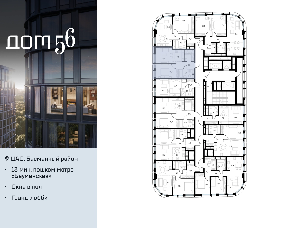 В премиум-квартале «Дом 56» на Бауманской напрямую от девелопера ГК «Галс-Девелопмент» представлена 1-комнатная квартира на 17 этаже общей площадью 46.80 м². Квартира предлагается без отделки, со свободной планировкой. Пространство позволяет воплотить дизайн - проект в соответствии с Вашими предпочтениями. «Дом 56» — расположен в Басманном районе на ул. Фридриха Энгельса, всего в 12-15 минутах пешком от станций метро «Бауманская» и «Электрозаводская». Рядом с премиум-кварталом находятся важные городские магистрали — ТТК, набережная реки Яузы и Бакунинская улица, переходящая в Спартаковскую и Маросейку. Архитектурный стиль «Дома 56» — параметрический минимализм. Футуристические фасады квартала с «эффектом закручивания» словно вращаются вокруг своей оси. Динамичный образ башен дополняет эффектное остекление — окна в пол будут в каждой квартире. «Дом 56» станет органичным продолжением современной научно-креативной среды Басманного района: — Развитое окружение — десятки различных точек притяжения; — Близость престижных вузов: МГТУ, МЭИ и Британская высшая школа дизайна; — Соседство с Технологической долиной и всем необходимым для запуска стартапа; — Набережные и парки для спорта и отдыха. «Дом 56» оснащён первоклассными инженерными системами. Входы на территорию, в здание и паркинг оборудованы системой контроля и управления доступом. С любого этажа в лобби и паркинг спускаются быстрые и бесшумные лифты премиального бренда. Во внутреннем приватном дворе будет создано пространство в бионическом стиле с лаунж-зонами, подвесными качелями, детскими плейхабами для разных возрастов, площадками для спорта и отдыха в окружении зелени. На двух подземных уровнях предусмотрен подземный паркинг и кладовые помещения.О застройщике
