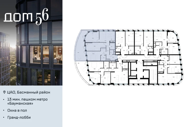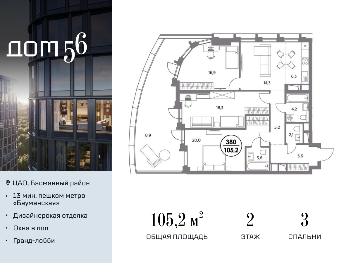 В премиум-квартале «Дом 56» на Бауманской напрямую от девелопера ГК «Галс-Девелопмент» представлена 3-комнатная квартира на 2 этаже общей площадью 105.20 м². Квартира предлагается без отделки, со свободной планировкой. Пространство позволяет воплотить дизайн - проект в соответствии с Вашими предпочтениями. «Дом 56» — расположен в Басманном районе на ул. Фридриха Энгельса, всего в 12-15 минутах пешком от станций метро «Бауманская» и «Электрозаводская». Рядом с премиум-кварталом находятся важные городские магистрали — ТТК, набережная реки Яузы и Бакунинская улица, переходящая в Спартаковскую и Маросейку. Архитектурный стиль «Дома 56» — параметрический минимализм. Футуристические фасады квартала с «эффектом закручивания» словно вращаются вокруг своей оси. Динамичный образ башен дополняет эффектное остекление — окна в пол будут в каждой квартире. «Дом 56» станет органичным продолжением современной научно-креативной среды Басманного района: — Развитое окружение — десятки различных точек притяжения; — Близость престижных вузов: МГТУ, МЭИ и Британская высшая школа дизайна; — Соседство с Технологической долиной и всем необходимым для запуска стартапа; — Набережные и парки для спорта и отдыха. «Дом 56» оснащён первоклассными инженерными системами. Входы на территорию, в здание и паркинг оборудованы системой контроля и управления доступом. С любого этажа в лобби и паркинг спускаются быстрые и бесшумные лифты премиального бренда. Во внутреннем приватном дворе будет создано пространство в бионическом стиле с лаунж-зонами, подвесными качелями, детскими плейхабами для разных возрастов, площадками для спорта и отдыха в окружении зелени. На двух подземных уровнях предусмотрен подземный паркинг и кладовые помещения.О застройщике