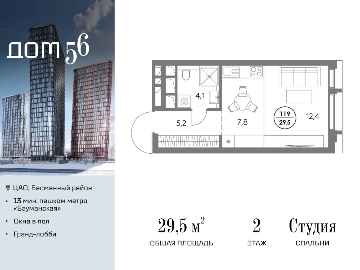 В премиум-квартале «Дом 56» на Бауманской напрямую от девелопера ГК «Галс-Девелопмент» представлена студия на 2 этаже общей площадью 29.50 м². Квартира предлагается без отделки, со свободной планировкой. Пространство позволяет воплотить дизайн - проект в соответствии с Вашими предпочтениями. «Дом 56» — расположен в Басманном районе на ул. Фридриха Энгельса, всего в 12-15 минутах пешком от станций метро «Бауманская» и «Электрозаводская». Рядом с премиум-кварталом находятся важные городские магистрали — ТТК, набережная реки Яузы и Бакунинская улица, переходящая в Спартаковскую и Маросейку. Архитектурный стиль «Дома 56» — параметрический минимализм. Футуристические фасады квартала с «эффектом закручивания» словно вращаются вокруг своей оси. Динамичный образ башен дополняет эффектное остекление — окна в пол будут в каждой квартире. «Дом 56» станет органичным продолжением современной научно-креативной среды Басманного района: — Развитое окружение — десятки различных точек притяжения; — Близость престижных вузов: МГТУ, МЭИ и Британская высшая школа дизайна; — Соседство с Технологической долиной и всем необходимым для запуска стартапа; — Набережные и парки для спорта и отдыха. «Дом 56» оснащён первоклассными инженерными системами. Входы на территорию, в здание и паркинг оборудованы системой контроля и управления доступом. С любого этажа в лобби и паркинг спускаются быстрые и бесшумные лифты премиального бренда. Во внутреннем приватном дворе будет создано пространство в бионическом стиле с лаунж-зонами, подвесными качелями, детскими плейхабами для разных возрастов, площадками для спорта и отдыха в окружении зелени. На двух подземных уровнях предусмотрен подземный паркинг и кладовые помещения.О застройщике