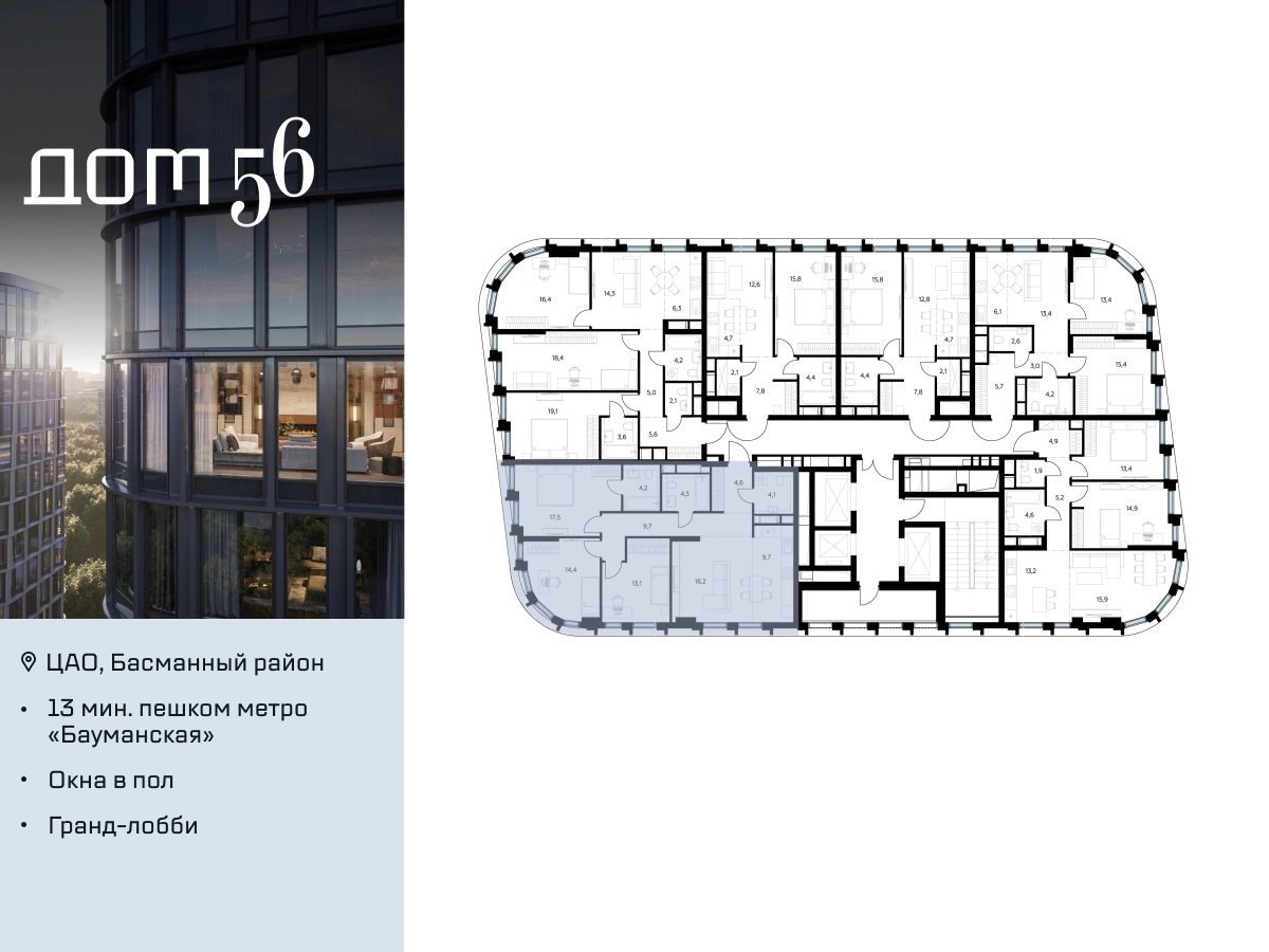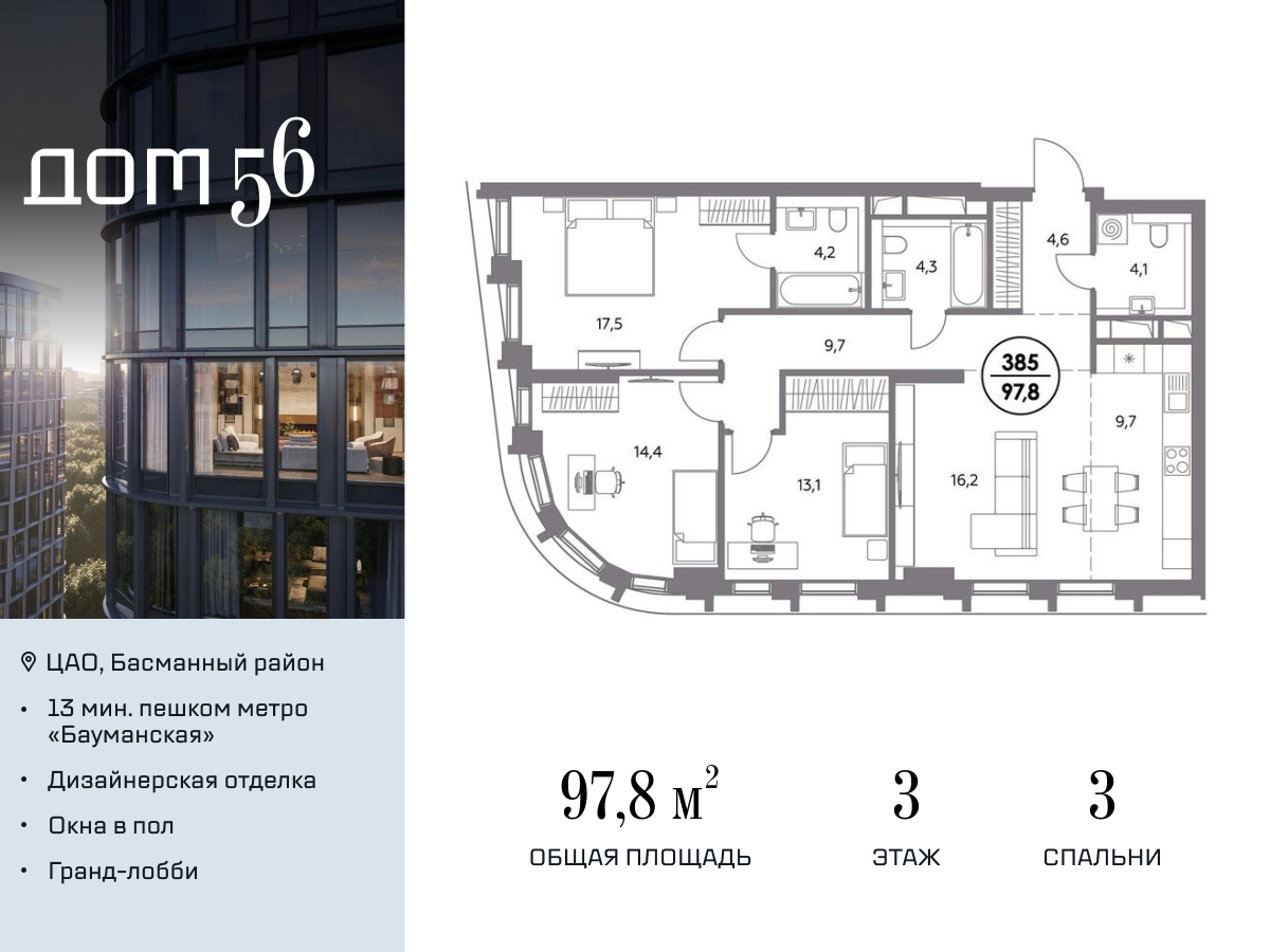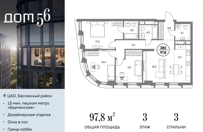В премиум-квартале «Дом 56» на Бауманской напрямую от девелопера ГК «Галс-Девелопмент» представлена 3-комнатная квартира на 3 этаже общей площадью 97.80 м². Квартира предлагается без отделки, со свободной планировкой. Пространство позволяет воплотить дизайн - проект в соответствии с Вашими предпочтениями. «Дом 56» — расположен в Басманном районе на ул. Фридриха Энгельса, всего в 12-15 минутах пешком от станций метро «Бауманская» и «Электрозаводская». Рядом с премиум-кварталом находятся важные городские магистрали — ТТК, набережная реки Яузы и Бакунинская улица, переходящая в Спартаковскую и Маросейку. Архитектурный стиль «Дома 56» — параметрический минимализм. Футуристические фасады квартала с «эффектом закручивания» словно вращаются вокруг своей оси. Динамичный образ башен дополняет эффектное остекление — окна в пол будут в каждой квартире. «Дом 56» станет органичным продолжением современной научно-креативной среды Басманного района: — Развитое окружение — десятки различных точек притяжения; — Близость престижных вузов: МГТУ, МЭИ и Британская высшая школа дизайна; — Соседство с Технологической долиной и всем необходимым для запуска стартапа; — Набережные и парки для спорта и отдыха. «Дом 56» оснащён первоклассными инженерными системами. Входы на территорию, в здание и паркинг оборудованы системой контроля и управления доступом. С любого этажа в лобби и паркинг спускаются быстрые и бесшумные лифты премиального бренда. Во внутреннем приватном дворе будет создано пространство в бионическом стиле с лаунж-зонами, подвесными качелями, детскими плейхабами для разных возрастов, площадками для спорта и отдыха в окружении зелени. На двух подземных уровнях предусмотрен подземный паркинг и кладовые помещения.О застройщике