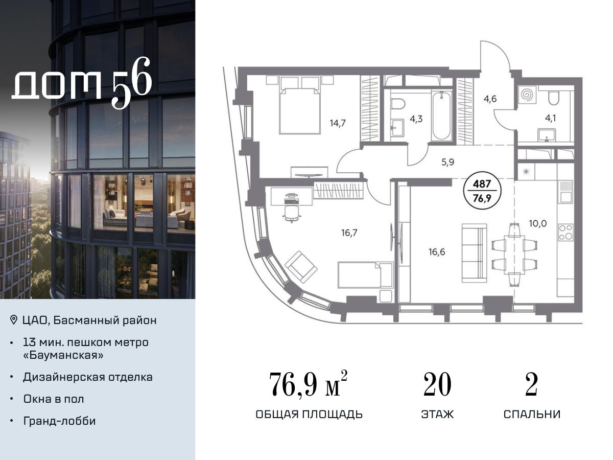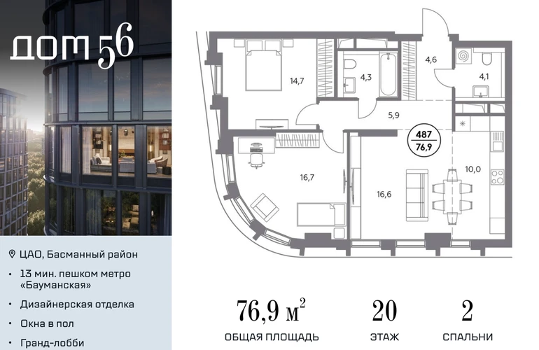 В премиум-квартале «Дом 56» на Бауманской напрямую от девелопера ГК «Галс-Девелопмент» представлена 2-комнатная квартира на 20 этаже общей площадью 76.90 м². Квартира предлагается без отделки, со свободной планировкой. Пространство позволяет воплотить дизайн - проект в соответствии с Вашими предпочтениями. «Дом 56» — расположен в Басманном районе на ул. Фридриха Энгельса, всего в 12-15 минутах пешком от станций метро «Бауманская» и «Электрозаводская». Рядом с премиум-кварталом находятся важные городские магистрали — ТТК, набережная реки Яузы и Бакунинская улица, переходящая в Спартаковскую и Маросейку. Архитектурный стиль «Дома 56» — параметрический минимализм. Футуристические фасады квартала с «эффектом закручивания» словно вращаются вокруг своей оси. Динамичный образ башен дополняет эффектное остекление — окна в пол будут в каждой квартире. «Дом 56» станет органичным продолжением современной научно-креативной среды Басманного района: — Развитое окружение — десятки различных точек притяжения; — Близость престижных вузов: МГТУ, МЭИ и Британская высшая школа дизайна; — Соседство с Технологической долиной и всем необходимым для запуска стартапа; — Набережные и парки для спорта и отдыха. «Дом 56» оснащён первоклассными инженерными системами. Входы на территорию, в здание и паркинг оборудованы системой контроля и управления доступом. С любого этажа в лобби и паркинг спускаются быстрые и бесшумные лифты премиального бренда. Во внутреннем приватном дворе будет создано пространство в бионическом стиле с лаунж-зонами, подвесными качелями, детскими плейхабами для разных возрастов, площадками для спорта и отдыха в окружении зелени. На двух подземных уровнях предусмотрен подземный паркинг и кладовые помещения.О застройщике