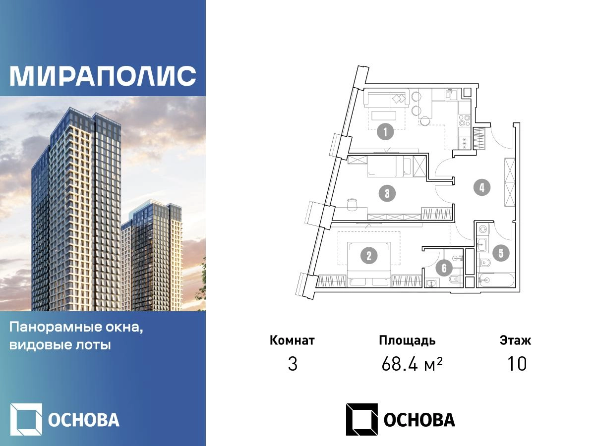 Продаются 4-к апартаменты площадью 68.4 кв.м. на 10-м этаже 33 этажного дома в ЖК "Мираполис" от ГК ОСНОВА. МИРАПОЛИС - проект для тех, кому важно, чтобы под рукой было всё для работы, отдыха и жизни. Проект состоит из четырех башен с авторскими стеклянными фасадами и lounge-rooftop под открытым небом. С высоты птичьего полета резиденты будут наслаждаться видами на город и расположенные рядом парки: "Лосиный остров", "Сокольники", "Ботанический сад", "Сад будущего" и "ВДНХ". МИРАПОЛИС расположен в 3 минутах пешком от МЦК "Ростокино". За 5 минут - можно добраться до ст.м. ВДНХ на машине, а быстрый выезд на главные транспортные магистрали (ТТК и Проспект мира) позволит доехать на личном авто до центра Москвы за полчаса. В просторных лобби с дизайнерской отделкой продуман круглосуточный консьерж-сервис, приватные зоны с мягкой мебелью и комнаты для мытья лап питомцам. Панорамные окна и потолки высотой 3,1 м, а система "умный дом" значительно упростит жизнь резидентам и автоматизирует бытовые процессы. Концептуальный проект предлагает все преимущества бизнес-класса: подземный паркинг, торговый центр и супермаркет, фитнес-клуб, бассейн и SPA, офисы и коворкинги - всё для полноценной и комфортной жизни в столице.О застройщике