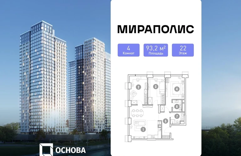 Продаются 4-к апартаменты площадью 93.2 кв.м. на 22-м этаже 33 этажного дома в ЖК "Мираполис" от ГК ОСНОВА. МИРАПОЛИС - проект для тех, кому важно, чтобы под рукой было всё для работы, отдыха и жизни. Проект состоит из четырех башен с авторскими стеклянными фасадами и lounge-rooftop под открытым небом. С высоты птичьего полета резиденты будут наслаждаться видами на город и расположенные рядом парки: "Лосиный остров", "Сокольники", "Ботанический сад", "Сад будущего" и "ВДНХ". МИРАПОЛИС расположен в 3 минутах пешком от МЦК "Ростокино". За 5 минут - можно добраться до ст.м. ВДНХ на машине, а быстрый выезд на главные транспортные магистрали (ТТК и Проспект мира) позволит доехать на личном авто до центра Москвы за полчаса. В просторных лобби с дизайнерской отделкой продуман круглосуточный консьерж-сервис, приватные зоны с мягкой мебелью и комнаты для мытья лап питомцам. Панорамные окна и потолки высотой 3,1 м, а система "умный дом" значительно упростит жизнь резидентам и автоматизирует бытовые процессы. Концептуальный проект предлагает все преимущества бизнес-класса: подземный паркинг, торговый центр и супермаркет, фитнес-клуб, бассейн и SPA, офисы и коворкинги - всё для полноценной и комфортной жизни в столице.О застройщике