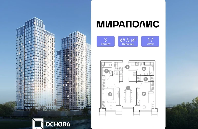 Продаются 3-к апартаменты площадью 69.5 кв.м. на 17-м этаже 33 этажного дома в ЖК "Мираполис" от ГК ОСНОВА. МИРАПОЛИС - проект для тех, кому важно, чтобы под рукой было всё для работы, отдыха и жизни. Проект состоит из четырех башен с авторскими стеклянными фасадами и lounge-rooftop под открытым небом. С высоты птичьего полета резиденты будут наслаждаться видами на город и расположенные рядом парки: "Лосиный остров", "Сокольники", "Ботанический сад", "Сад будущего" и "ВДНХ". МИРАПОЛИС расположен в 3 минутах пешком от МЦК "Ростокино". За 5 минут - можно добраться до ст.м. ВДНХ на машине, а быстрый выезд на главные транспортные магистрали (ТТК и Проспект мира) позволит доехать на личном авто до центра Москвы за полчаса. В просторных лобби с дизайнерской отделкой продуман круглосуточный консьерж-сервис, приватные зоны с мягкой мебелью и комнаты для мытья лап питомцам. Панорамные окна и потолки высотой 3,1 м, а система "умный дом" значительно упростит жизнь резидентам и автоматизирует бытовые процессы. Концептуальный проект предлагает все преимущества бизнес-класса: подземный паркинг, торговый центр и супермаркет, фитнес-клуб, бассейн и SPA, офисы и коворкинги - всё для полноценной и комфортной жизни в столице.О застройщике