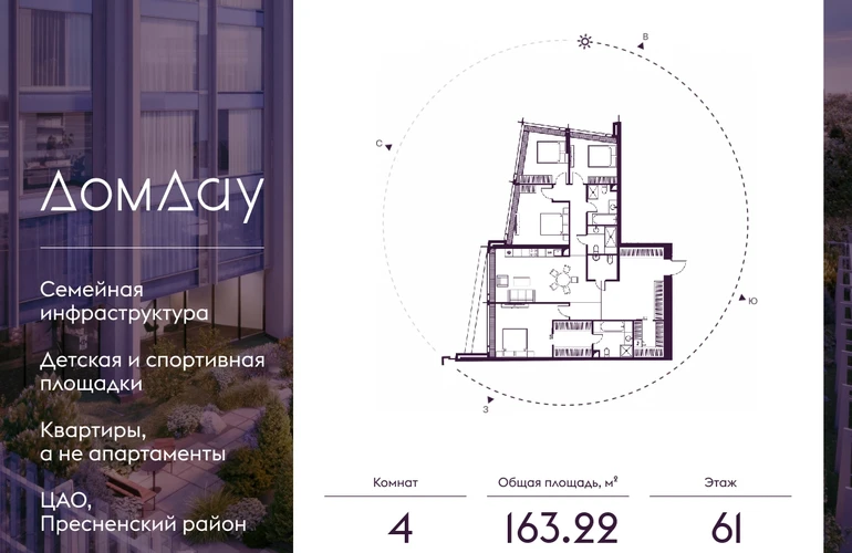 Прoдаётся 4-кoмнaтнaя квартира на 61 этаже площадью 163.22 м² в "Дом Дау" - небоскребе нового поколения в “Москва-Сити”.Уникальный проект «Дом Дау» — эксклюзивный жилой небоскреб, расположенный в самом сердце деловой столицы России. Это больше, чем жилье, это воплощение мечты о комфорте, эстетике и эксклюзивности, идеальное сочетание делового ритма мегаполиса и личного пространства.