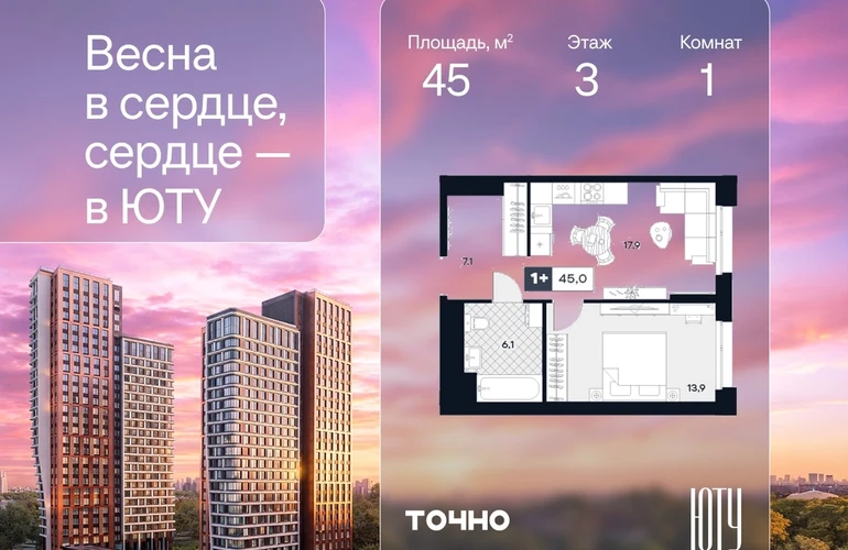 ЮТУ-камерные небоскребы бизнес-класса с исключительной архитектурой, видовыми квартирами и подходом к большой воде-благоустроенной набережной канала имени Москвы. Проект ЮТУ создает идеальный баланс жизни в городе. Это приватный оазис, где в любой момент можно сменить контекст и выбрать любой из тысячи маршрутов к активному отдыху и ярким впечатлениям. Локация премиум-класса • Первая линии в прибрежной части Химкинского водохранилища • Исключительно тихий и зелёный район Южное Тушино • За 2 минуты можно спуститься к воде, за 10 минут найти зеленые парки и готовую инфраструктуру, за 30 минут доехать до Кремля Концепция проекта • Две футуристичные башни, соединенные торговой галереей от бюро ATRIUM • 60 неповторяющихся планировок: квартиры с угловым «плавным» панорамным остеклением, мастер-спальнями и гостиными до 39м² и просто очень большие квартиры площадью до 128,6 м² • Беспрецедентная коллекция видов-в проекте 80 % видовых квартир Чувство эксклюзивности • Своя приватная жилая экосистема -только для резидентов домов • Лаунж-терраса на крыше • Пространство скрыто от посторонних глаз-с трех сторон его окружают строения проекта Прогрессивные технологии • 3-уровневая система безопасности (Face ID, BLE-метки, видеонаблюдение) • Умный паркинг с распознаванием номеров Проект федерального девелопера ТОЧНО-из ТОП-3 застройщиков России. Компания в проекте реализует ответственный подход к развитию пространств для благополучной жизни человека. И что в ЮТУ особенное воплощение приобретает концепция человекоцентричности, как заметная грань девелопмента ТОЧНО.О застройщике