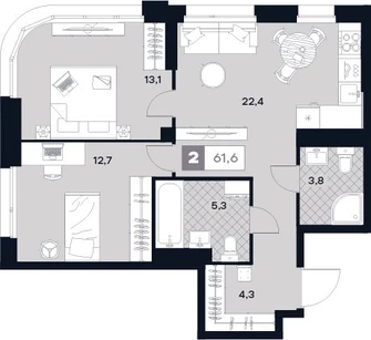 2-ком, 61.6 кв.м., 5/21эт.