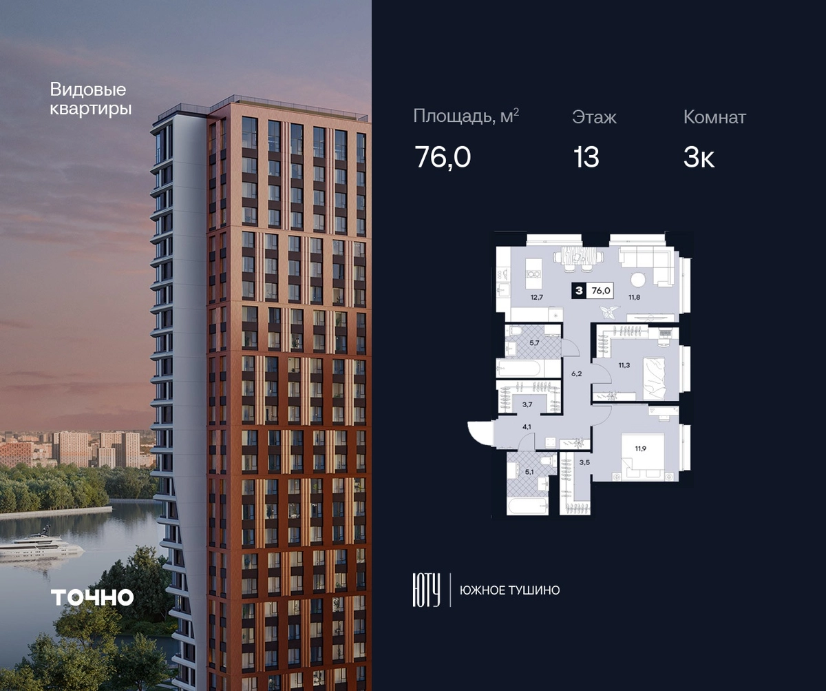 ЮТУ-камерные небоскребы бизнес-класса с исключительной архитектурой, видовыми квартирами и подходом к большой воде-благоустроенной набережной канала имени Москвы. Проект ЮТУ создает идеальный баланс жизни в городе. Это приватный оазис, где в любой момент можно сменить контекст и выбрать любой из тысячи маршрутов к активному отдыху и ярким впечатлениям. Локация премиум-класса • Первая линии в прибрежной части Химкинского водохранилища • Исключительно тихий и зелёный район Южное Тушино • За 2 минуты можно спуститься к воде, за 10 минут найти зеленые парки и готовую инфраструктуру, за 30 минут доехать до Кремля Концепция проекта • Две футуристичные башни, соединенные торговой галереей от бюро ATRIUM • 60 неповторяющихся планировок: квартиры с угловым «плавным» панорамным остеклением, мастер-спальнями и гостиными до 39м² и просто очень большие квартиры площадью до 128,6 м² • Беспрецедентная коллекция видов-в проекте 80 % видовых квартир Чувство эксклюзивности • Своя приватная жилая экосистема -только для резидентов домов • Лаунж-терраса на крыше • Пространство скрыто от посторонних глаз-с трех сторон его окружают строения проекта Прогрессивные технологии • 3-уровневая система безопасности (Face ID, BLE-метки, видеонаблюдение) • Умный паркинг с распознаванием номеров Проект федерального девелопера ТОЧНО-из ТОП-3 застройщиков России. Компания в проекте реализует ответственный подход к развитию пространств для благополучной жизни человека. И что в ЮТУ особенное воплощение приобретает концепция человекоцентричности, как заметная грань девелопмента ТОЧНО.