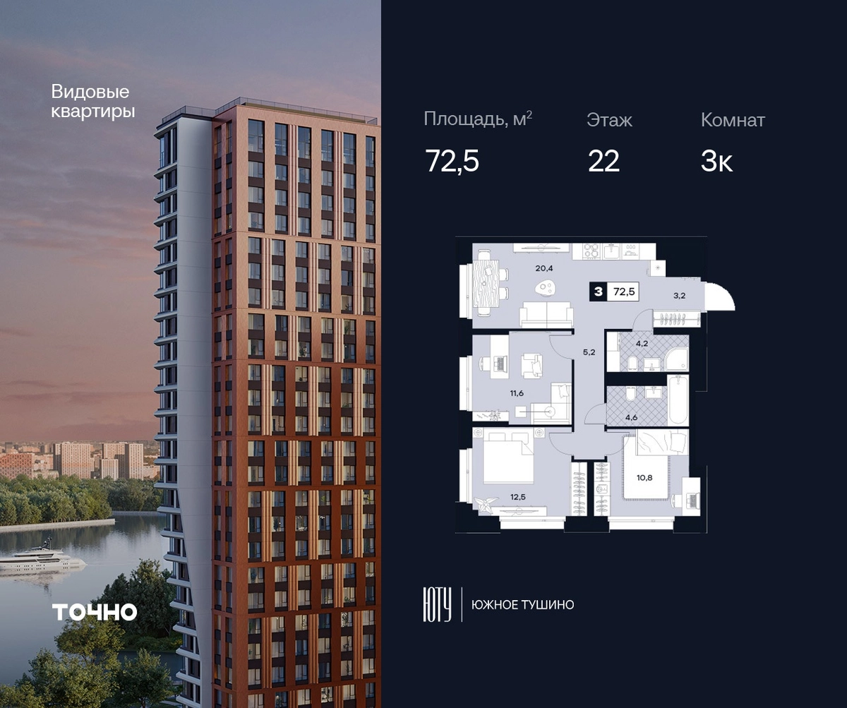 ЮТУ-камерные небоскребы бизнес-класса с исключительной архитектурой, видовыми квартирами и подходом к большой воде-благоустроенной набережной канала имени Москвы. Проект ЮТУ создает идеальный баланс жизни в городе. Это приватный оазис, где в любой момент можно сменить контекст и выбрать любой из тысячи маршрутов к активному отдыху и ярким впечатлениям. Локация премиум-класса • Первая линии в прибрежной части Химкинского водохранилища • Исключительно тихий и зелёный район Южное Тушино • За 2 минуты можно спуститься к воде, за 10 минут найти зеленые парки и готовую инфраструктуру, за 30 минут доехать до Кремля Концепция проекта • Две футуристичные башни, соединенные торговой галереей от бюро ATRIUM • 60 неповторяющихся планировок: квартиры с угловым «плавным» панорамным остеклением, мастер-спальнями и гостиными до 39м² и просто очень большие квартиры площадью до 128,6 м² • Беспрецедентная коллекция видов-в проекте 80 % видовых квартир Чувство эксклюзивности • Своя приватная жилая экосистема -только для резидентов домов • Лаунж-терраса на крыше • Пространство скрыто от посторонних глаз-с трех сторон его окружают строения проекта Прогрессивные технологии • 3-уровневая система безопасности (Face ID, BLE-метки, видеонаблюдение) • Умный паркинг с распознаванием номеров Проект федерального девелопера ТОЧНО-из ТОП-3 застройщиков России. Компания в проекте реализует ответственный подход к развитию пространств для благополучной жизни человека. И что в ЮТУ особенное воплощение приобретает концепция человекоцентричности, как заметная грань девелопмента ТОЧНО.