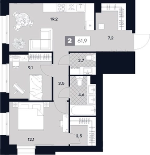 2-ком, 61.9 кв.м., 2/29эт.