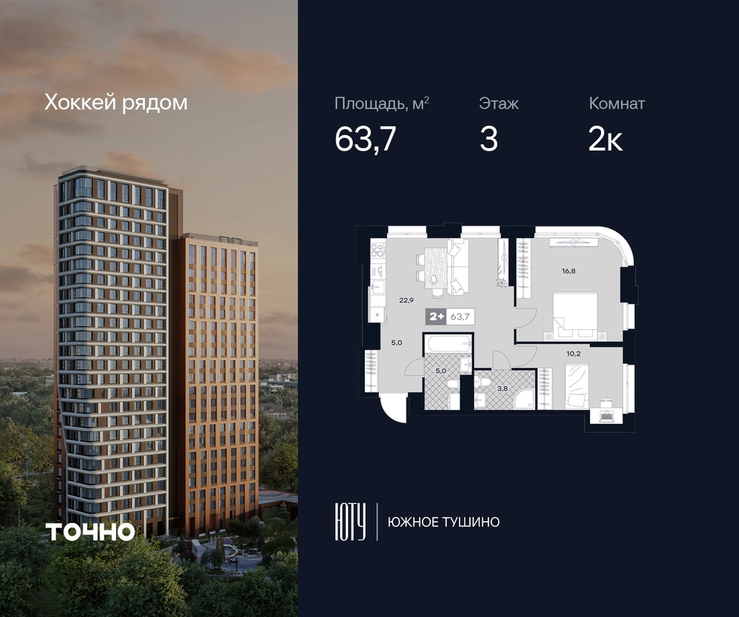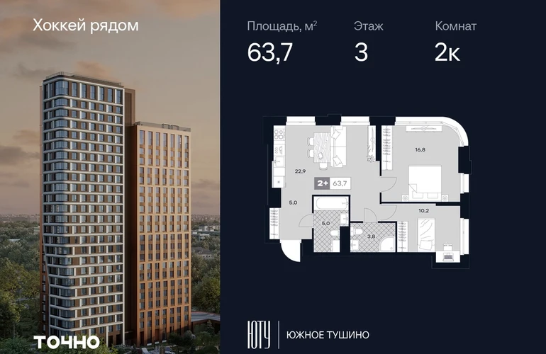 ЮТУ-камерные небоскребы бизнес-класса с исключительной архитектурой, видовыми квартирами и подходом к большой воде-благоустроенной набережной канала имени Москвы. Проект ЮТУ создает идеальный баланс жизни в городе. Это приватный оазис, где в любой момент можно сменить контекст и выбрать любой из тысячи маршрутов к активному отдыху и ярким впечатлениям. Локация премиум-класса • Первая линии в прибрежной части Химкинского водохранилища • Исключительно тихий и зелёный район Южное Тушино • За 2 минуты можно спуститься к воде, за 10 минут найти зеленые парки и готовую инфраструктуру, за 30 минут доехать до Кремля Концепция проекта • Две футуристичные башни, соединенные торговой галереей от бюро ATRIUM • 60 неповторяющихся планировок: квартиры с угловым «плавным» панорамным остеклением, мастер-спальнями и гостиными до 39м² и просто очень большие квартиры площадью до 128,6 м² • Беспрецедентная коллекция видов-в проекте 80 % видовых квартир Чувство эксклюзивности • Своя приватная жилая экосистема -только для резидентов домов • Лаунж-терраса на крыше • Пространство скрыто от посторонних глаз-с трех сторон его окружают строения проекта Прогрессивные технологии • 3-уровневая система безопасности (Face ID, BLE-метки, видеонаблюдение) • Умный паркинг с распознаванием номеров Проект федерального девелопера ТОЧНО-из ТОП-3 застройщиков России. Компания в проекте реализует ответственный подход к развитию пространств для благополучной жизни человека. И что в ЮТУ особенное воплощение приобретает концепция человекоцентричности, как заметная грань девелопмента ТОЧНО.