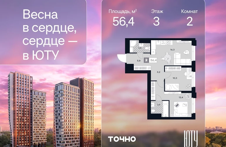 ЮТУ-камерные небоскребы бизнес-класса с исключительной архитектурой, видовыми квартирами и подходом к большой воде-благоустроенной набережной канала имени Москвы. Проект ЮТУ создает идеальный баланс жизни в городе. Это приватный оазис, где в любой момент можно сменить контекст и выбрать любой из тысячи маршрутов к активному отдыху и ярким впечатлениям. Локация премиум-класса • Первая линии в прибрежной части Химкинского водохранилища • Исключительно тихий и зелёный район Южное Тушино • За 2 минуты можно спуститься к воде, за 10 минут найти зеленые парки и готовую инфраструктуру, за 30 минут доехать до Кремля Концепция проекта • Две футуристичные башни, соединенные торговой галереей от бюро ATRIUM • 60 неповторяющихся планировок: квартиры с угловым «плавным» панорамным остеклением, мастер-спальнями и гостиными до 39м² и просто очень большие квартиры площадью до 128,6 м² • Беспрецедентная коллекция видов-в проекте 80 % видовых квартир Чувство эксклюзивности • Своя приватная жилая экосистема -только для резидентов домов • Лаунж-терраса на крыше • Пространство скрыто от посторонних глаз-с трех сторон его окружают строения проекта Прогрессивные технологии • 3-уровневая система безопасности (Face ID, BLE-метки, видеонаблюдение) • Умный паркинг с распознаванием номеров Проект федерального девелопера ТОЧНО-из ТОП-3 застройщиков России. Компания в проекте реализует ответственный подход к развитию пространств для благополучной жизни человека. И что в ЮТУ особенное воплощение приобретает концепция человекоцентричности, как заметная грань девелопмента ТОЧНО.