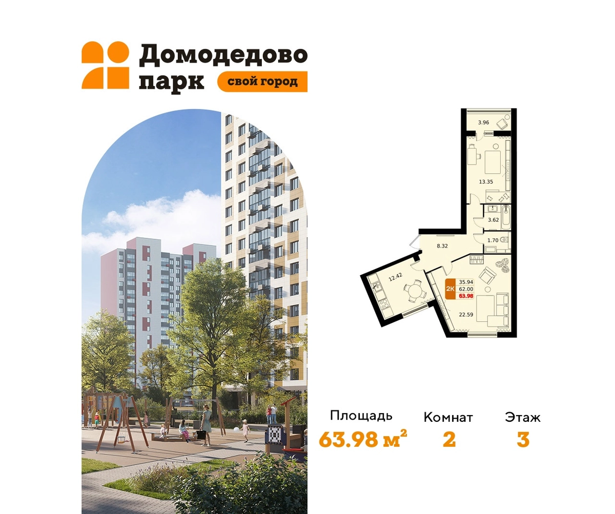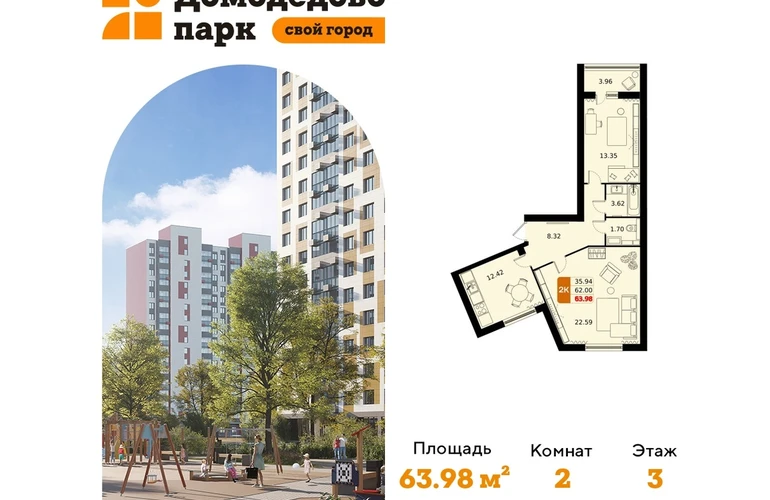 Выгода до 27%. Срок сдачи 2026 год. Продажа напрямую от застройщика в жилом комплексе комфорт класса "Домодедово парк" площадью 63.80 кв.м на 3 этаже 17 этажного дома. Квартира с предчистовой отделкой.Квартиры