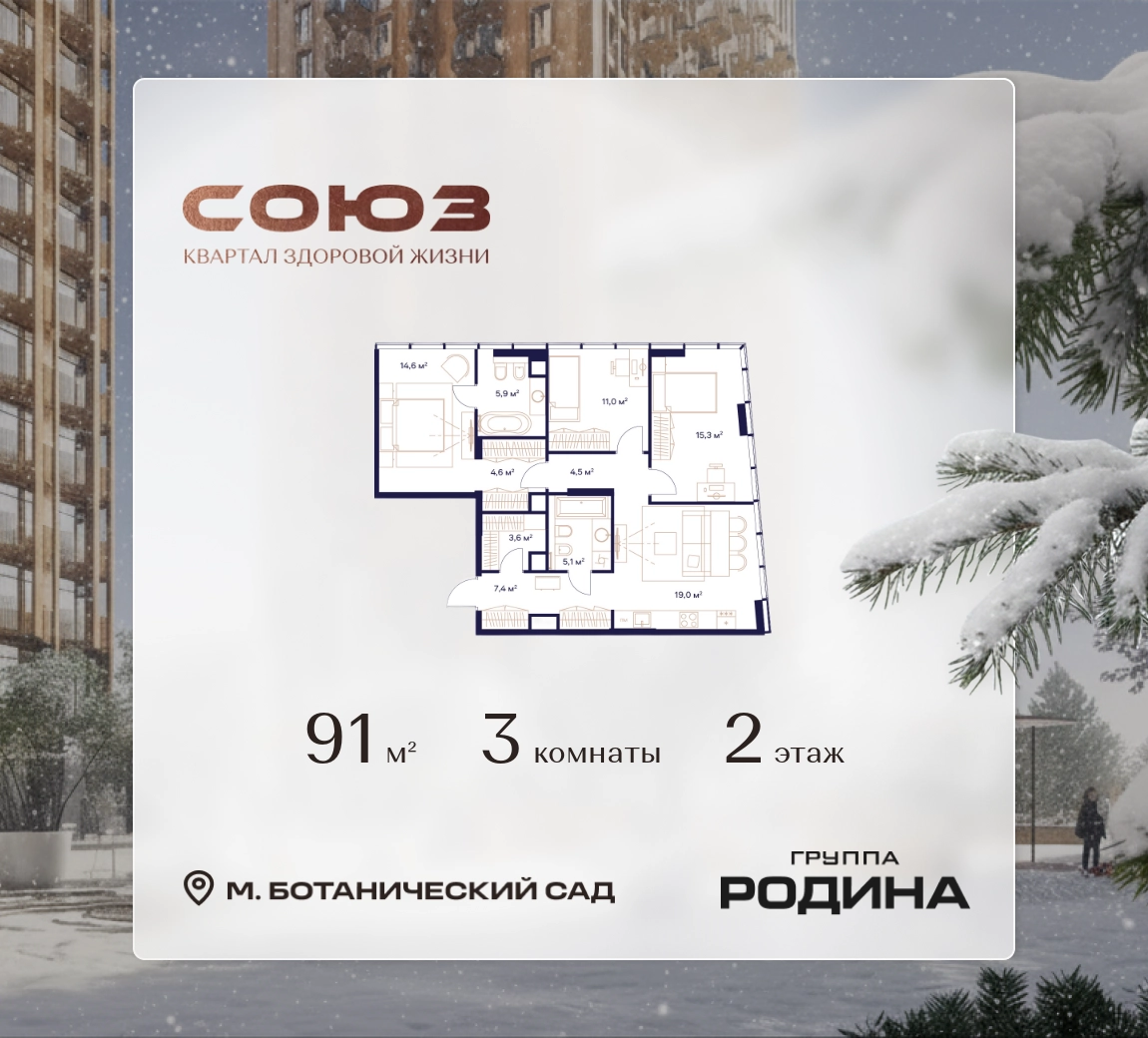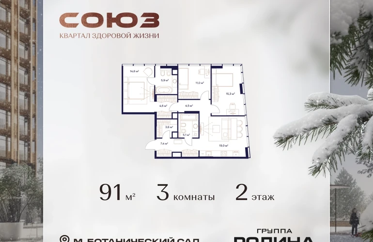 Рассрочка 0%Продаётся 3-комнатная квартира площадью 91 м² на 2 этаже в Жилом Комплексе «Союз».