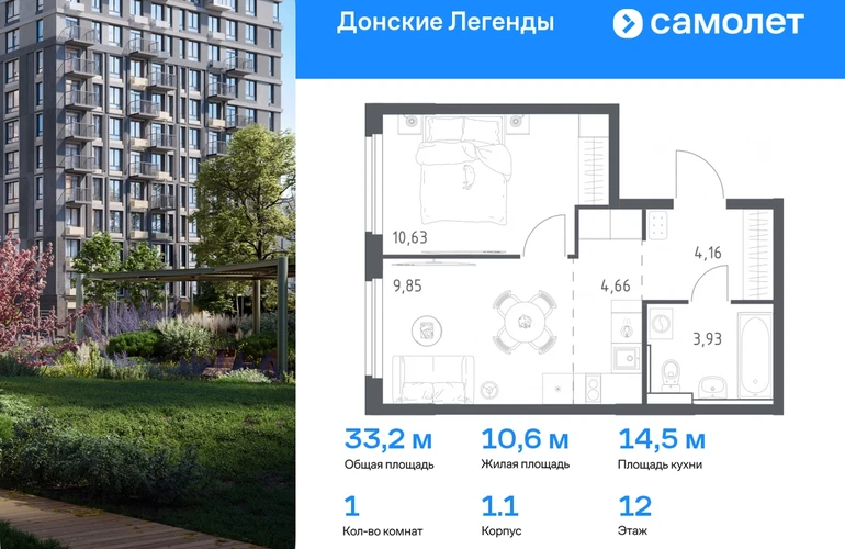 Строим кварталы для жизни с заботой о будущем. Предлагается 1-комнатная квартира комфорт-класса 33,23 кв.м в корпусе 1.1 на 12 этаже, в ЖК «Донские Легенды» Квартира без отделки. Доступность опции «отделка» и возможность комплектации мебелью и декором уточняйте у застройщика. Приобрести квартиру возможно по специальным акциям от застройщика, с текущими условиями акций можно ознакомиться в блоке «Акций». Цена динамическая и может отличаться, уточняйте актуальность у застройщика. Чувствовать гордость, когда любимая команда забивает гол, и с удовольствием спешить на тренировку по мини-футболу или теннису — так выглядит атмосфера в «Квартале Чехова» в Ленинском районе. Здесь каждый день станет ценным экспонатом в вашей коллекции впечатлений. Проект расположен рядом с Восточным шоссе и улицей Пойменной, всего в 10 минутах на машине от центра города. За 3 минуты вы доберетесь до Ворошиловского моста, а за 4 — до Темерницкого. Если не хотите ехать на машине, рядом остановки автобусов. Поблизости находится спортивный комплекс «Гребной канал Дон», а стадион «Ростов Арена» ждет любителей футбола. Прогуляться по благоустроенной набережной, повеселиться в аквапарке и подкрепиться мороженым можно в Левобережном парке — до него 5 минут на такси. Утро начнется с прогулки с малышом до одного из 3 детских садов. Рядом есть школа для ребят постарше, детская школа искусств, центр культурного развития и ФОК. В квартале откроются поликлиника со станцией скорой помощи и 2 торговых центра. Архитектура квартала сочетает современность и изящество. Элегантные французские балконы и панорамные окна позволят наслаждаться великолепными пейзажами. Во дворе дети играют на площадках, а взрослые занимаются спортом. У жителей будет собственный ипподром для соревнований по конкуру. А еще подземный и многоуровневые паркинги на 7,5 тысячи машино-мест. Входы в подъезды расположены на уровне земли, что удобно для родителей с колясками и путешественников. Для будущих жителей — квартиры без отделки. Можно реализовать любые дизайнерские идеи в своем новом доме.#yan19-2r1788822#О застройщике