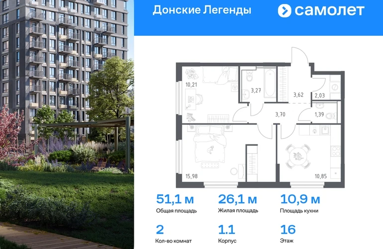 Строим кварталы для жизни с заботой о будущем. Предлагается 2-комнатная квартира комфорт-класса 51,05 кв.м в корпусе 1.1 на 16 этаже, в ЖК «Донские Легенды» Квартира без отделки. Доступность опции «отделка» и возможность комплектации мебелью и декором уточняйте у застройщика. Приобрести квартиру возможно по специальным акциям от застройщика, с текущими условиями акций можно ознакомиться в блоке «Акций». Цена динамическая и может отличаться, уточняйте актуальность у застройщика. Чувствовать гордость, когда любимая команда забивает гол, и с удовольствием спешить на тренировку по мини-футболу или теннису — так выглядит атмосфера в «Квартале Чехова» в Ленинском районе. Здесь каждый день станет ценным экспонатом в вашей коллекции впечатлений. Проект расположен рядом с Восточным шоссе и улицей Пойменной, всего в 10 минутах на машине от центра города. За 3 минуты вы доберетесь до Ворошиловского моста, а за 4 — до Темерницкого. Если не хотите ехать на машине, рядом остановки автобусов. Поблизости находится спортивный комплекс «Гребной канал Дон», а стадион «Ростов Арена» ждет любителей футбола. Прогуляться по благоустроенной набережной, повеселиться в аквапарке и подкрепиться мороженым можно в Левобережном парке — до него 5 минут на такси. Утро начнется с прогулки с малышом до одного из 3 детских садов. Рядом есть школа для ребят постарше, детская школа искусств, центр культурного развития и ФОК. В квартале откроются поликлиника со станцией скорой помощи и 2 торговых центра. Архитектура квартала сочетает современность и изящество. Элегантные французские балконы и панорамные окна позволят наслаждаться великолепными пейзажами. Во дворе дети играют на площадках, а взрослые занимаются спортом. У жителей будет собственный ипподром для соревнований по конкуру. А еще подземный и многоуровневые паркинги на 7,5 тысячи машино-мест. Входы в подъезды расположены на уровне земли, что удобно для родителей с колясками и путешественников. Для будущих жителей — квартиры без отделки. Можно реализовать любые дизайнерские идеи в своем новом доме.#yan19-2r1790885#О застройщике