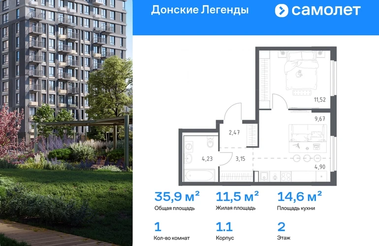 Строим кварталы для жизни с заботой о будущем. Предлагается 1-комнатная квартира комфорт-класса 35,94 кв.м в корпусе 1.1 на 2 этаже, в ЖК «Донские Легенды» Квартира без отделки. Доступность опции «отделка» и возможность комплектации мебелью и декором уточняйте у застройщика. Приобрести квартиру возможно по специальным акциям от застройщика, с текущими условиями акций можно ознакомиться в блоке «Акций». Цена динамическая и может отличаться, уточняйте актуальность у застройщика. Чувствовать гордость, когда любимая команда забивает гол, и с удовольствием спешить на тренировку по мини-футболу или теннису — так выглядит атмосфера в «Квартале Чехова» в Ленинском районе. Здесь каждый день станет ценным экспонатом в вашей коллекции впечатлений. Проект расположен рядом с Восточным шоссе и улицей Пойменной, всего в 10 минутах на машине от центра города. За 3 минуты вы доберетесь до Ворошиловского моста, а за 4 — до Темерницкого. Если не хотите ехать на машине, рядом остановки автобусов. Поблизости находится спортивный комплекс «Гребной канал Дон», а стадион «Ростов Арена» ждет любителей футбола. Прогуляться по благоустроенной набережной, повеселиться в аквапарке и подкрепиться мороженым можно в Левобережном парке — до него 5 минут на такси. Утро начнется с прогулки с малышом до одного из 3 детских садов. Рядом есть школа для ребят постарше, детская школа искусств, центр культурного развития и ФОК. В квартале откроются поликлиника со станцией скорой помощи и 2 торговых центра. Архитектура квартала сочетает современность и изящество. Элегантные французские балконы и панорамные окна позволят наслаждаться великолепными пейзажами. Во дворе дети играют на площадках, а взрослые занимаются спортом. У жителей будет собственный ипподром для соревнований по конкуру. А еще подземный и многоуровневые паркинги на 7,5 тысячи машино-мест. Входы в подъезды расположены на уровне земли, что удобно для родителей с колясками и путешественников. Для будущих жителей — квартиры без отделки. Можно реализовать любые дизайнерские идеи в своем новом доме.#yan19-2r1821614#О застройщике