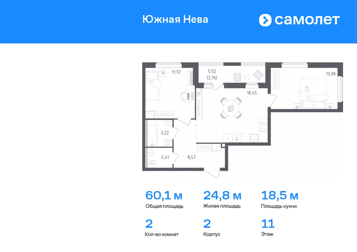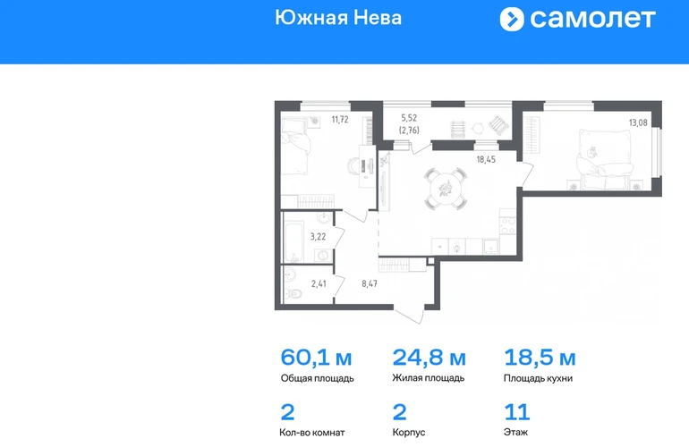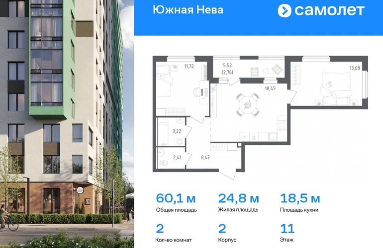 Строим кварталы для жизни с заботой о будущем. Предлагается 2-комнатная квартира комфорт-класса 60,11 кв.м в корпусе 2 на 11 этаже, в ЖК «Южная Нева» Квартира без отделки. Доступность опции «отделка» и возможность комплектации мебелью и декором уточняйте у застройщика. Приобрести квартиру возможно по специальным акциям от застройщика, с текущими условиями акций можно ознакомиться в блоке «Акций». Цена динамическая и может отличаться, уточняйте актуальность у застройщика. Спокойное течение Невы, монументальные арки Володарского моста и простор лесопарка создают атмосферу жилого комплекса «Южная Нева». До КАДа — всего 5 минут, до центра города — 30 минут на машине, а станция метро «Пролетарская» в 10 минутах. Для любителей природы рядом Невский лесопарк и «МЕГА Парк», где можно бегать, кататься на велосипеде или посетить веревочный парк. Для детей предусмотрены школа и 2 детских сада, а на первых этажах домов откроются салоны красоты, магазины и кафе. В шаговой доступности — фитнес-центр и торговые центры «МЕГА Дыбенко» и «Лондон Молл». Комплекс состоит из 11 монолитных домов высотой от 12 до 23 этажей с разноцветными фасадами и панорамными балконами. Двор украшают 7 мостов-навесов, а центральная аллея — собственная Нева. Здесь можно позагорать на лежаках или поиграть в шахматы, позаниматься на спортивной площадке или отвести ребенка в игровую зону на встречу с друзьями. В «Южной Неве» есть планировки с проходными кухнями-гостиными и гардеробными.#yan19-2r1743684#О застройщике