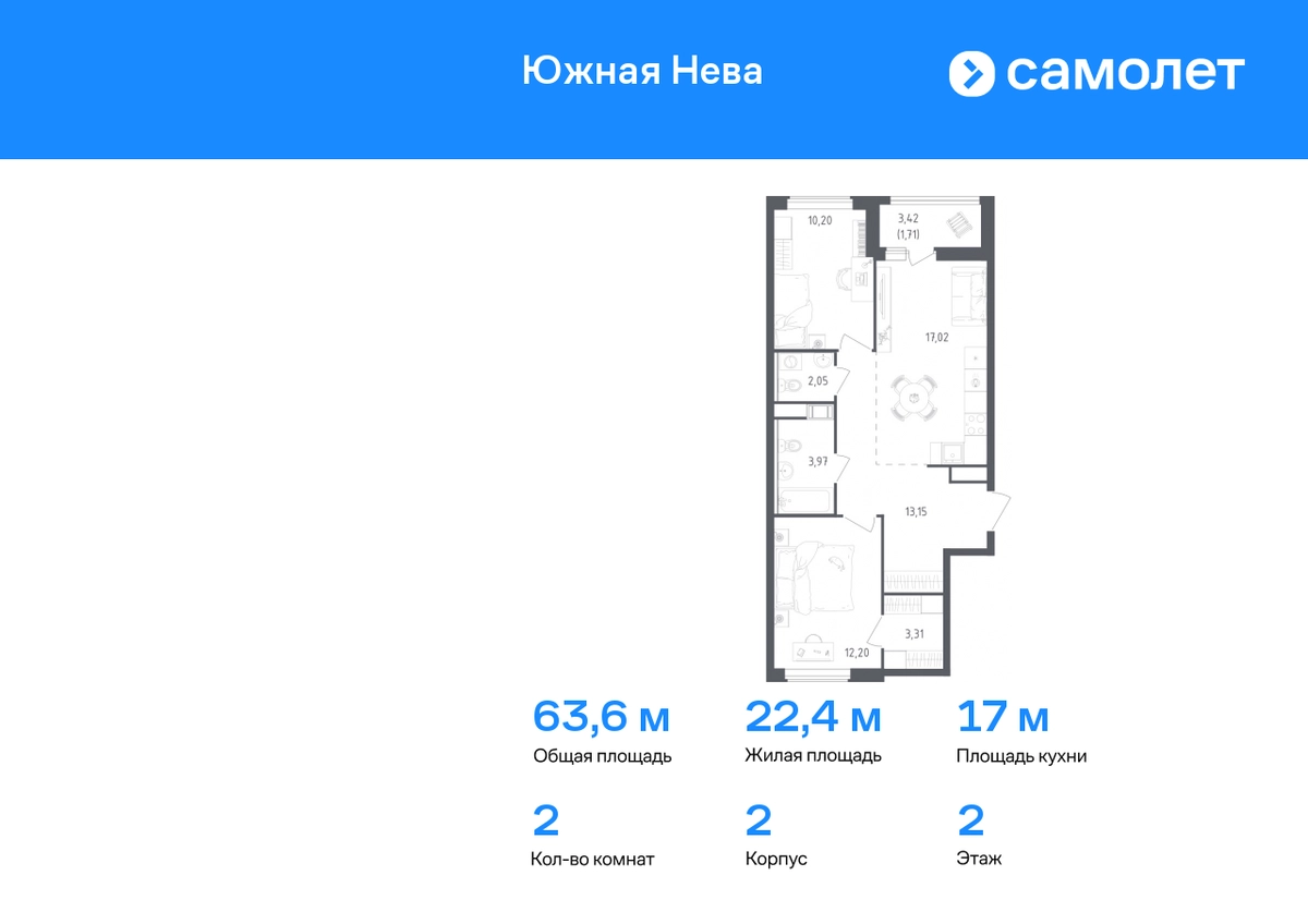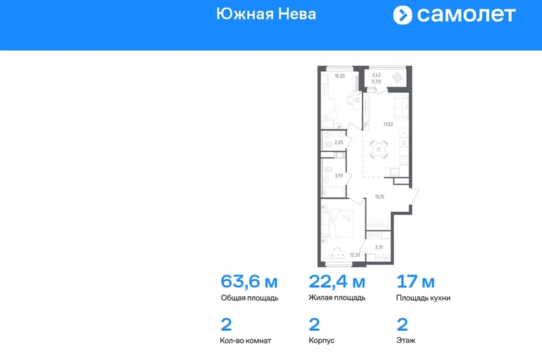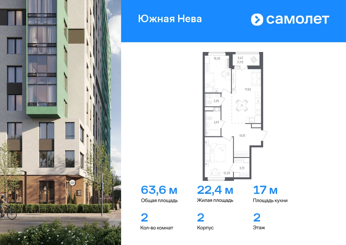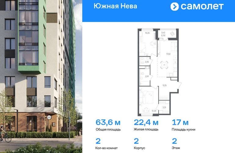 Строим кварталы для жизни с заботой о будущем. Предлагается 2-комнатная квартира комфорт-класса 63,61 кв.м в корпусе 2 на 2 этаже, в ЖК «Южная Нева» Квартира без отделки. Доступность опции «отделка» и возможность комплектации мебелью и декором уточняйте у застройщика. Приобрести квартиру возможно по специальным акциям от застройщика, с текущими условиями акций можно ознакомиться в блоке «Акций». Цена динамическая и может отличаться, уточняйте актуальность у застройщика. Спокойное течение Невы, монументальные арки Володарского моста и простор лесопарка создают атмосферу жилого комплекса «Южная Нева». До КАДа — всего 5 минут, до центра города — 30 минут на машине, а станция метро «Пролетарская» в 10 минутах. Для любителей природы рядом Невский лесопарк и «МЕГА Парк», где можно бегать, кататься на велосипеде или посетить веревочный парк. Для детей предусмотрены школа и 2 детских сада, а на первых этажах домов откроются салоны красоты, магазины и кафе. В шаговой доступности — фитнес-центр и торговые центры «МЕГА Дыбенко» и «Лондон Молл». Комплекс состоит из 11 монолитных домов высотой от 12 до 23 этажей с разноцветными фасадами и панорамными балконами. Двор украшают 7 мостов-навесов, а центральная аллея — собственная Нева. Здесь можно позагорать на лежаках или поиграть в шахматы, позаниматься на спортивной площадке или отвести ребенка в игровую зону на встречу с друзьями. В «Южной Неве» есть планировки с проходными кухнями-гостиными и гардеробными.#yan19-2r1762167#О застройщике