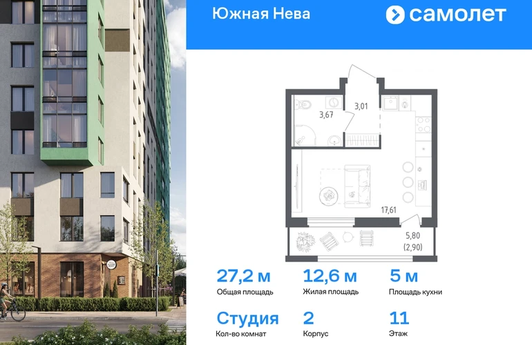 Строим кварталы для жизни с заботой о будущем. Предлагается квартира студия комфорт-класса 27,19 кв.м в корпусе 2 на 11 этаже, в ЖК «Южная Нева» Квартира без отделки. Доступность опции «отделка» и возможность комплектации мебелью и декором уточняйте у застройщика. Приобрести квартиру возможно по специальным акциям от застройщика, с текущими условиями акций можно ознакомиться в блоке «Акций». Цена динамическая и может отличаться, уточняйте актуальность у застройщика. Спокойное течение Невы, монументальные арки Володарского моста и простор лесопарка создают атмосферу жилого комплекса «Южная Нева». До КАДа — всего 5 минут, до центра города — 30 минут на машине, а станция метро «Пролетарская» в 10 минутах. Для любителей природы рядом Невский лесопарк и «МЕГА Парк», где можно бегать, кататься на велосипеде или посетить веревочный парк. Для детей предусмотрены школа и 2 детских сада, а на первых этажах домов откроются салоны красоты, магазины и кафе. В шаговой доступности — фитнес-центр и торговые центры «МЕГА Дыбенко» и «Лондон Молл». Комплекс состоит из 11 монолитных домов высотой от 12 до 23 этажей с разноцветными фасадами и панорамными балконами. Двор украшают 7 мостов-навесов, а центральная аллея — собственная Нева. Здесь можно позагорать на лежаках или поиграть в шахматы, позаниматься на спортивной площадке или отвести ребенка в игровую зону на встречу с друзьями. В «Южной Неве» есть планировки с проходными кухнями-гостиными и гардеробными.#yan19-2r1769144#О застройщике