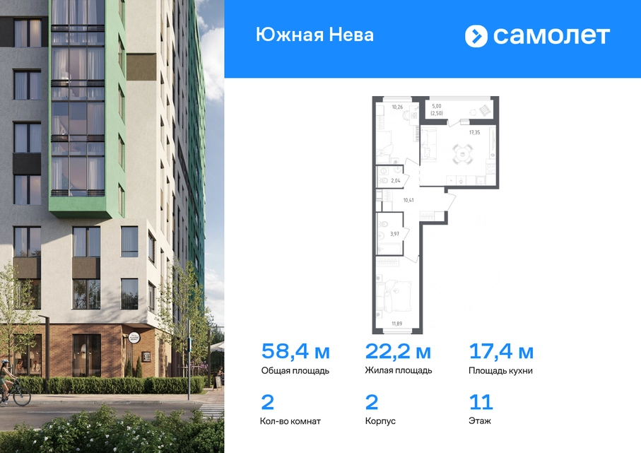 Строим кварталы для жизни с заботой о будущем. Предлагается 2-комнатная квартира комфорт-класса 58,42 кв.м в корпусе 2 на 11 этаже, в ЖК «Южная Нева» Квартира без отделки. Доступность опции «отделка» и возможность комплектации мебелью и декором уточняйте у застройщика. Приобрести квартиру возможно по специальным акциям от застройщика, с текущими условиями акций можно ознакомиться в блоке «Акций». Цена динамическая и может отличаться, уточняйте актуальность у застройщика. Спокойное течение Невы, монументальные арки Володарского моста и простор лесопарка создают атмосферу жилого комплекса «Южная Нева». До КАДа — всего 5 минут, до центра города — 30 минут на машине, а станция метро «Пролетарская» в 10 минутах. Для любителей природы рядом Невский лесопарк и «МЕГА Парк», где можно бегать, кататься на велосипеде или посетить веревочный парк. Для детей предусмотрены школа и 2 детских сада, а на первых этажах домов откроются салоны красоты, магазины и кафе. В шаговой доступности — фитнес-центр и торговые центры «МЕГА Дыбенко» и «Лондон Молл». Комплекс состоит из 11 монолитных домов высотой от 12 до 23 этажей с разноцветными фасадами и панорамными балконами. Двор украшают 7 мостов-навесов, а центральная аллея — собственная Нева. Здесь можно позагорать на лежаках или поиграть в шахматы, позаниматься на спортивной площадке или отвести ребенка в игровую зону на встречу с друзьями. В «Южной Неве» есть планировки с проходными кухнями-гостиными и гардеробными.#yan19-2r1798815#О застройщике