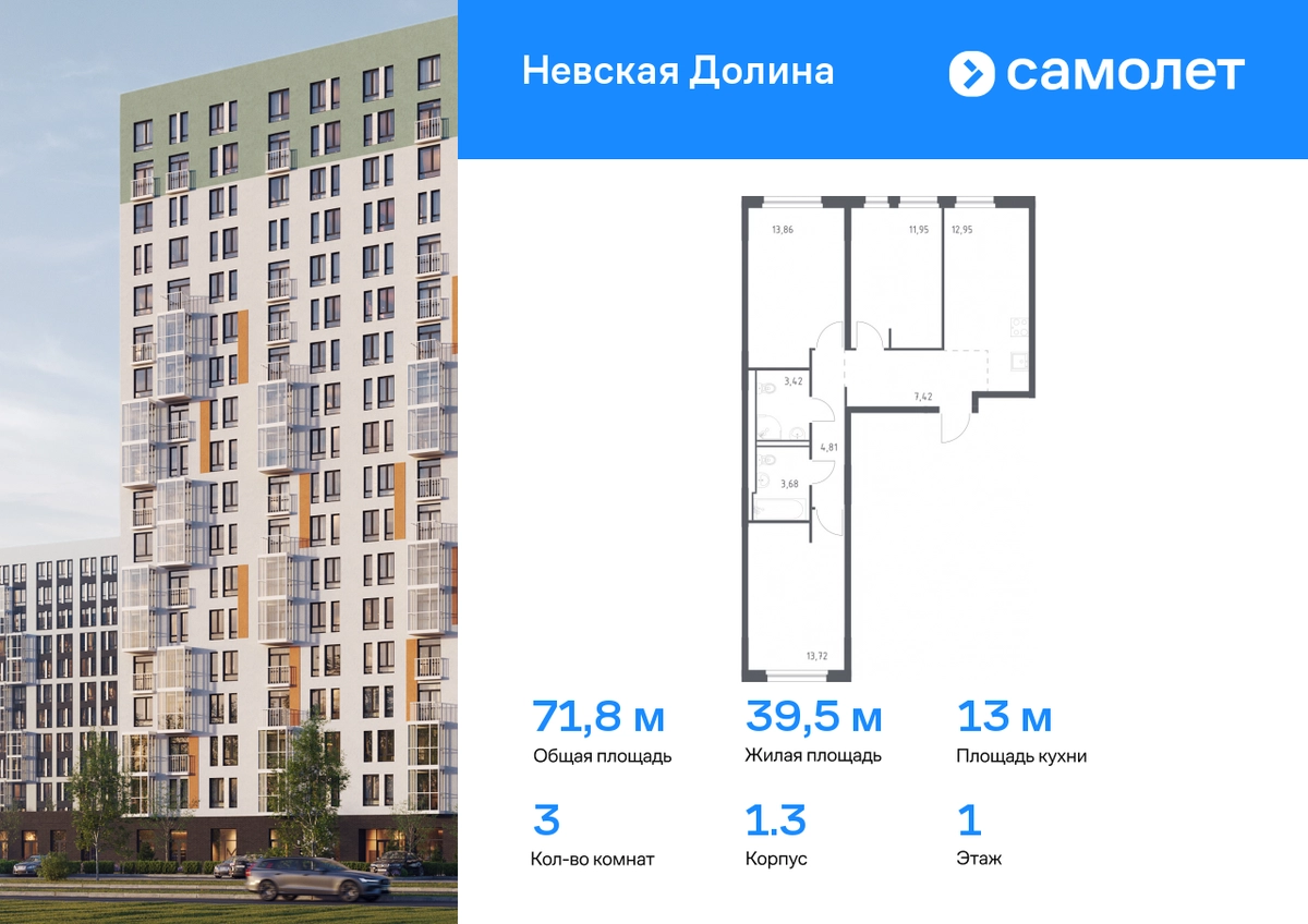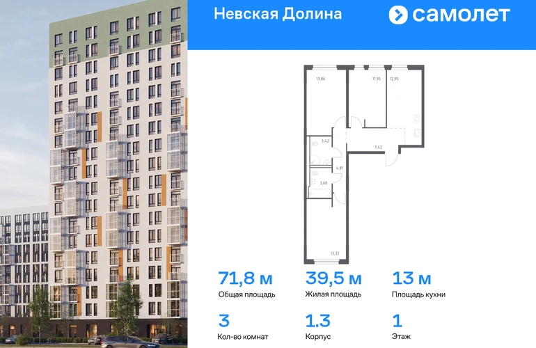 Строим кварталы для жизни с заботой о будущем. Предлагается 3-комнатная квартира комфорт-класса 71,81 кв.м в корпусе 1.3 на 1 этаже, в ЖК «Невская Долина» Квартира с чистовой отделкой. Доступность дополнительных опций уточняйте у застройщика. Приобрести квартиру возможно по специальным акциям от застройщика, с текущими условиями акций можно ознакомиться в блоке «Акций». Цена динамическая и может отличаться, уточняйте актуальность у застройщика. «Невская Долина» — зеленый холст для вашей жизни с уникальными палисадниками, садами и уютными уголками для отдыха. Всего в 5 минутах на машине — КАД, рядом — Большой Обуховский мост. До центра Петербурга — 35 минут на авто, до метро «Пролетарская» — 15 минут, до аэропорта Пулково — 30 минут. Комплекс находится на правом берегу Невы, рядом с Невским лесопарком, «МЕГА Парком» и парком развлечений. Скоро во дворе комплекса построят 4 детских сада и 2 школы. Рядом уже есть магазины «Дикси», «Магнит», пункты выдачи и аптеки. На первых этажах будут кафе и минимаркеты, откроется медицинский центр и физкультурно-оздоровительный комплекс. Архитектура домов сочетает в себе современность и функциональность — фасады украшены большими окнами, лоджиями, обычными и французскими балконами. В «Невской Долине» есть сады плодовых культур, игровые и спортивные зоны, 11 многоуровневых паркингов.#yan19-2r1459820#О застройщике